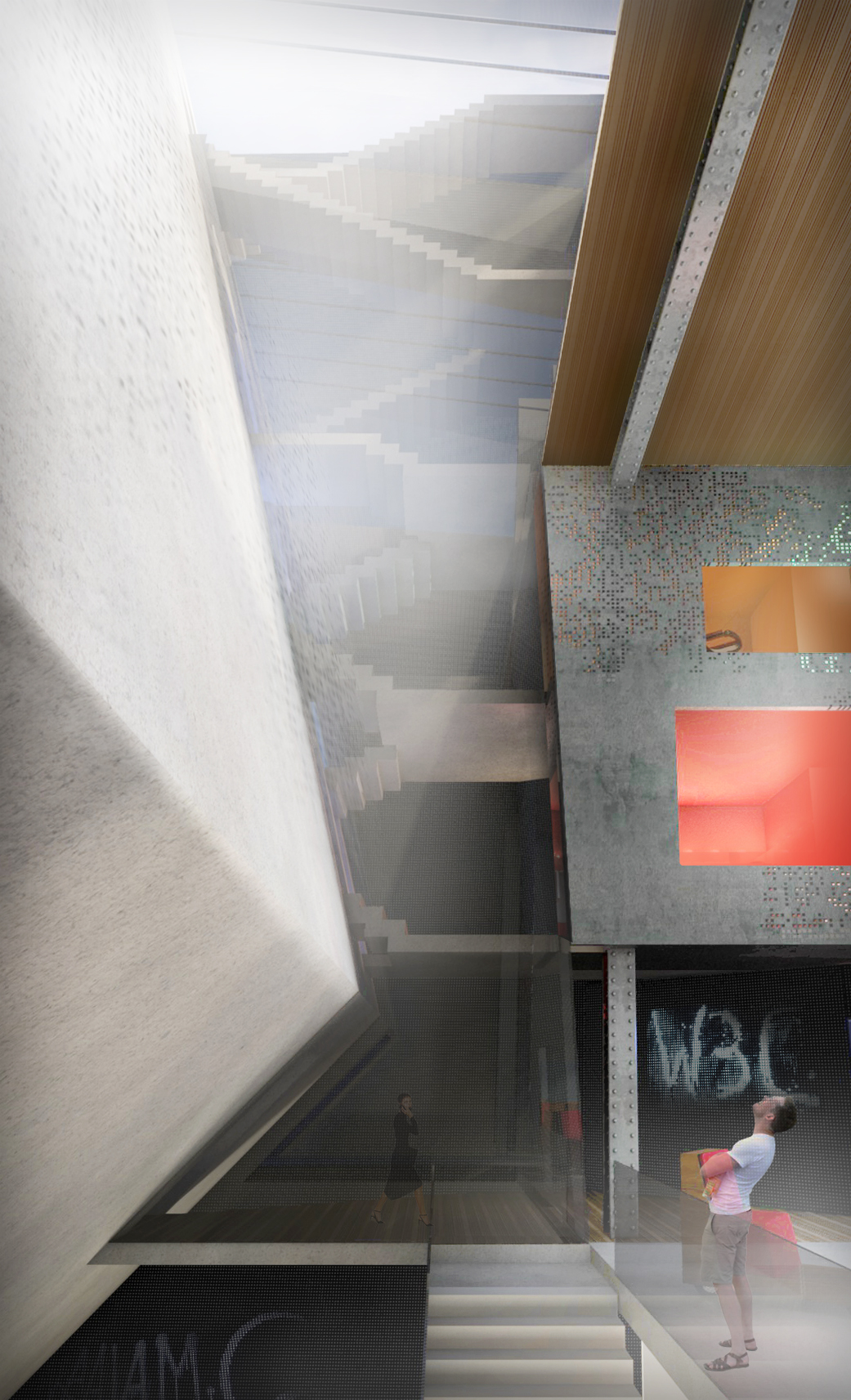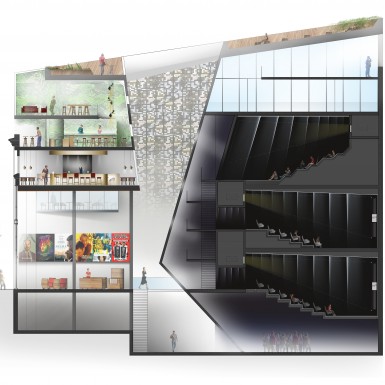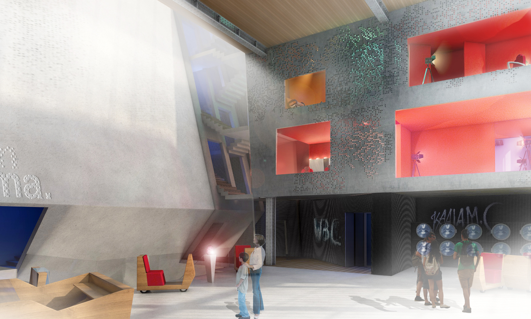 Autre changement majeur, celui du brouillage des lignes entre le producteur et le consommateur. La démocratisation des technologies de captation et de diffusion a rendu la frontière poreuse, les usagers s’intéressent de plus en plus aux moyens de production, les coulisses de l’image deviennent une nouvelle forme de divertissement, plus encore les usagers deviennent à leur tour producteurs de médias ; les POM (petits objets multimédias) ou les chaines youtube de particuliers « amateurs » étant symptomatiques de ces changements. C’est pourquoi Ema donnera à voir le cinéma tel qu’il se fait dans ses nouvelles formes et genèses. La transparence de l’espace ainsi que l’accès libre permettra de voir les studios de tournage et de montage de courts-métrages ou de visiter les ateliers des costumiers, des maquilleurs et des coiffeurs de la petite industrie du cinéma présente sur place. Car oui, Ema ne sera pas uniquement un lieu de projection, cette transparence sera certes à la fois attraction et vitrine pour le grand public mais aussi un lieu d’incitation à la création. L’ancienne sous-station électrique se fera donc productrice d’une énergie créative. A côté des studios d’enregistrement et du film lab pour le montage situé en sous-sol, les utilisateurs deviendront contributeurs et feront évoluer le contenu de la banque de données de la médiathèque placée en open source. Les outils de numérisation du film lab permettront à ceux qui le souhaitent de convertir leurs anciennes VHS et autres supports aux nouveaux formats. Les salles et le plateau seront équipées de matériel afin de diffuser tables rondes, MOOC (cours universitaires en lignes) et discussions. Enfin comme couronnant le tout, placés sous le toit-jardin du bâtiment, des bureaux partagés favoriseront les émulations interdisciplinaires.