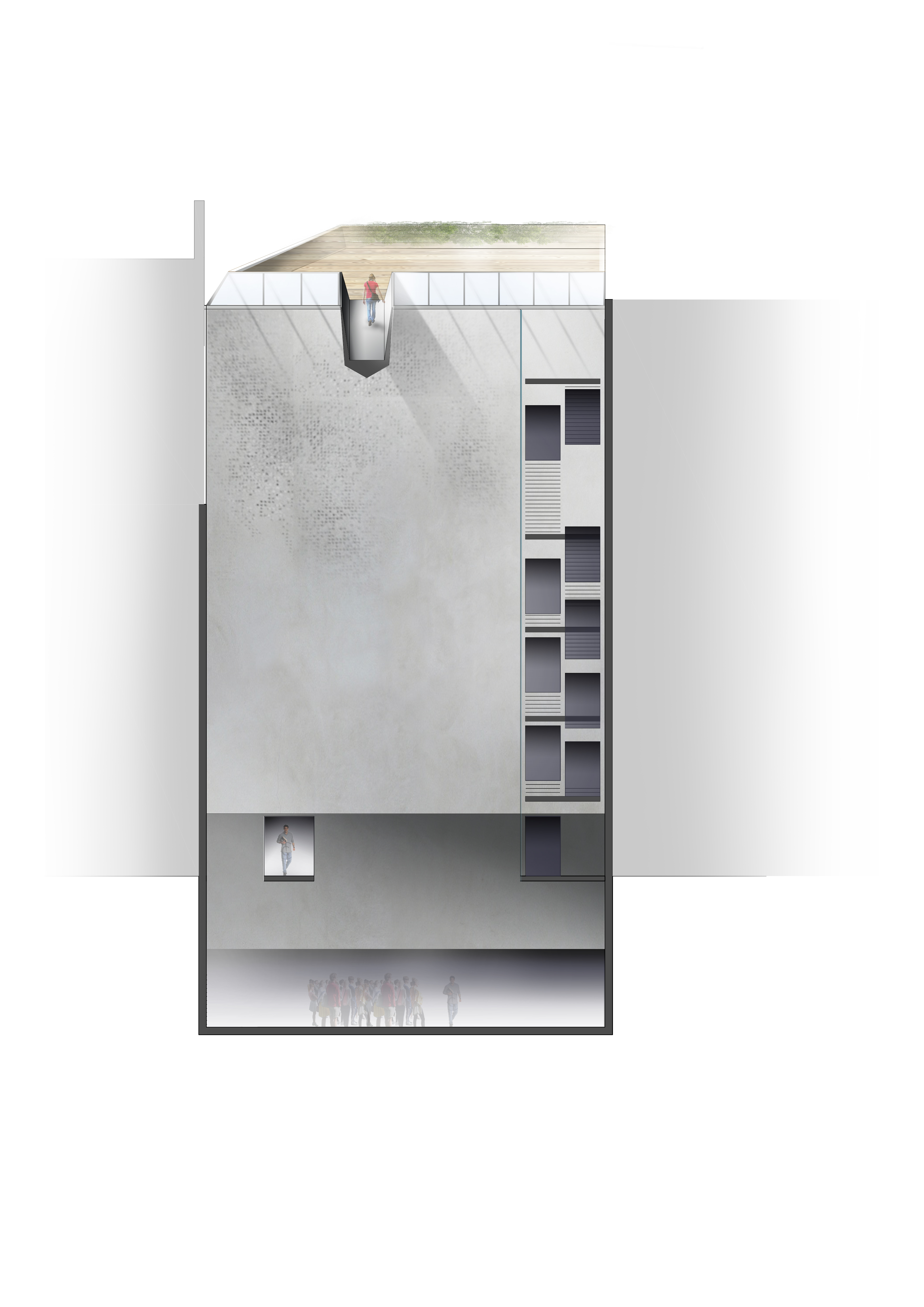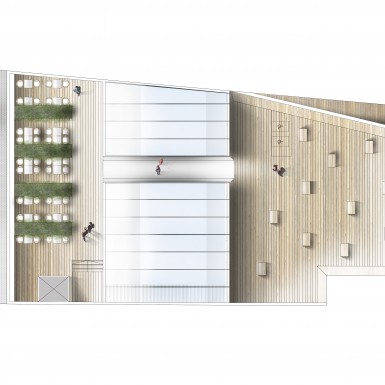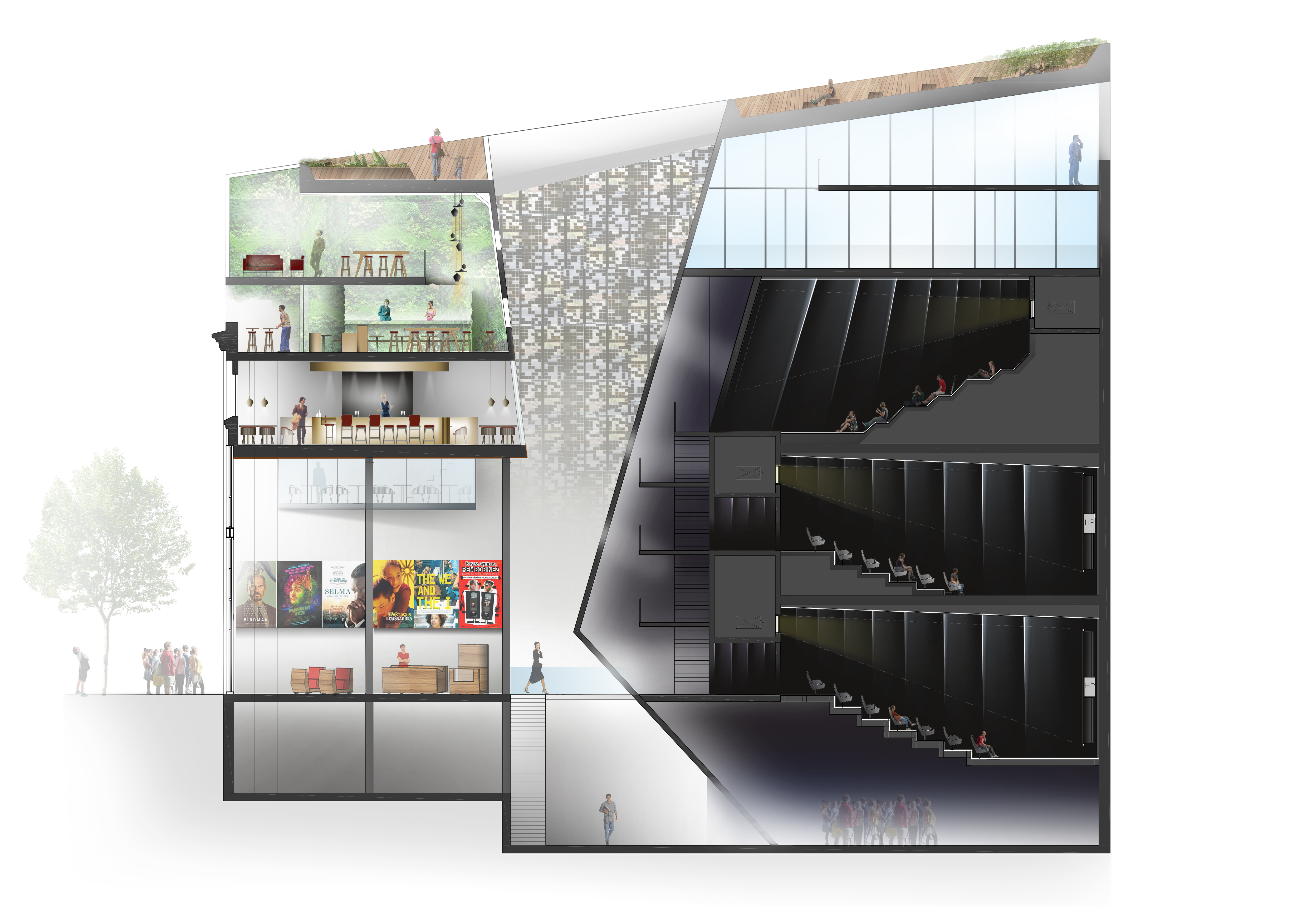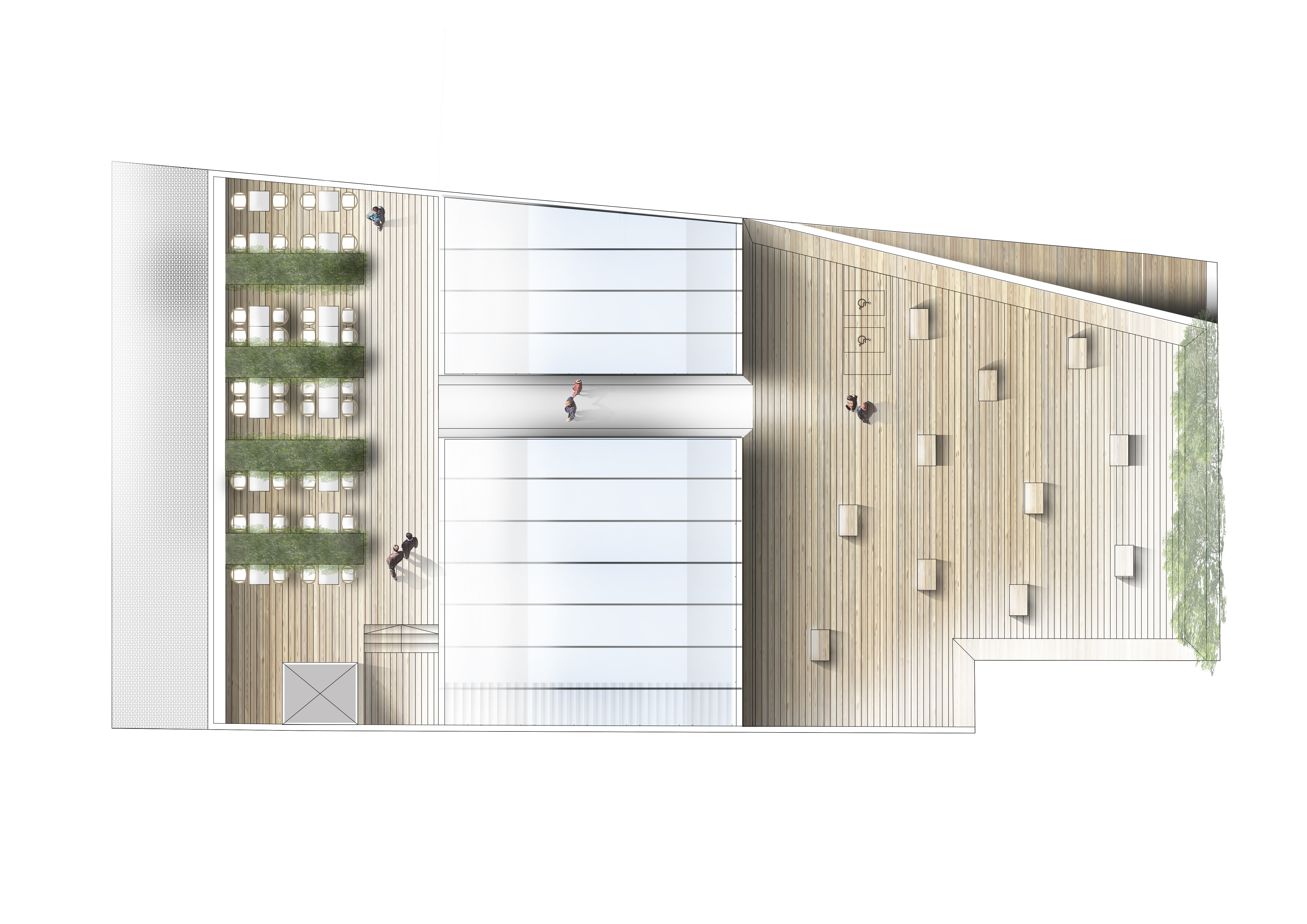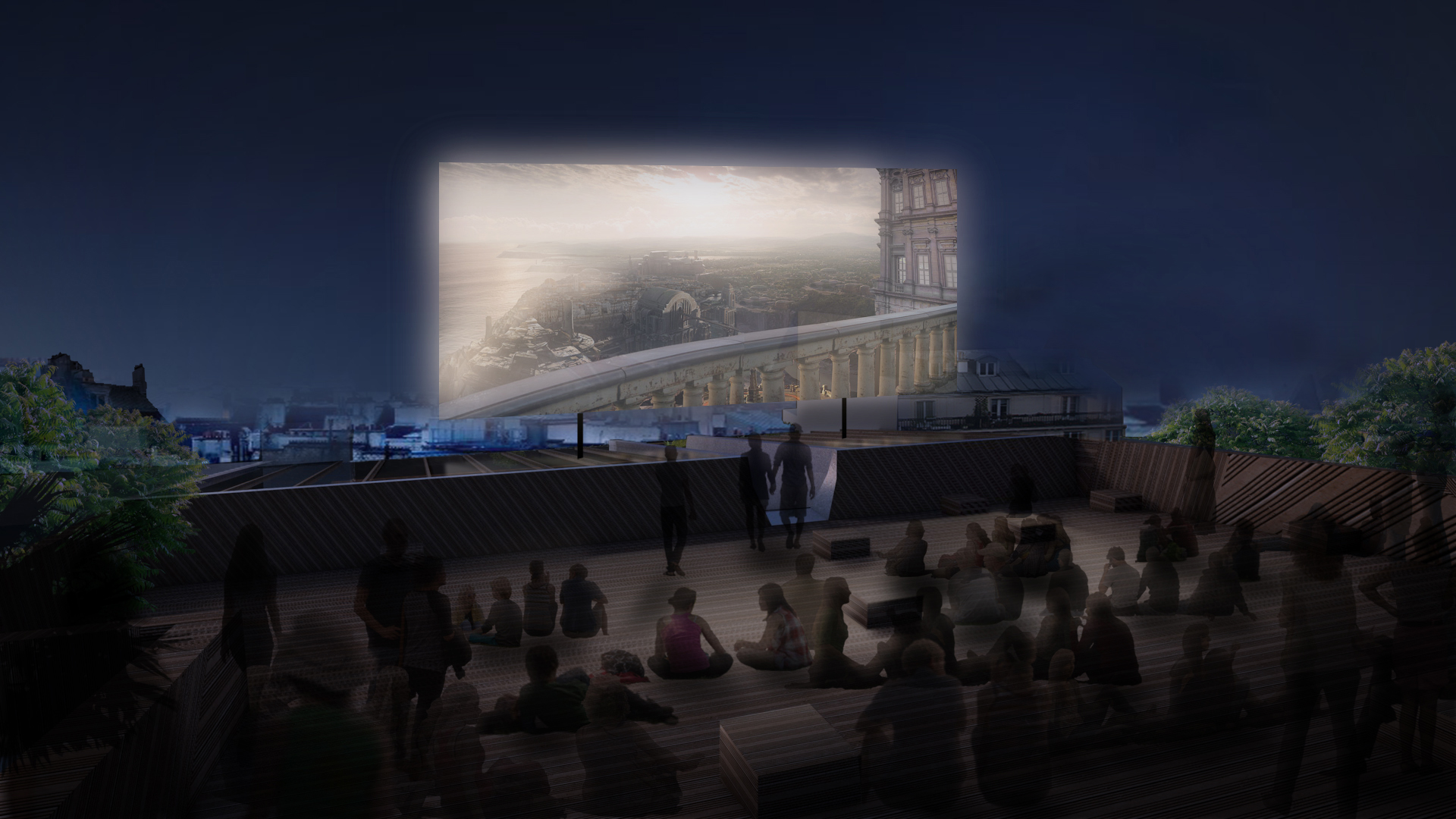 Dans ce lieu, la corporalité dans le visionnage est comme partie intégrante de l’expérience du spectateur et ainsi, la transforme. La gemme se décompose en un spectre sur cinq niveaux : Les deux salles centrales, proposent une configuration classique et de qualité convenant à la majorité des conditions de projection et accessible au plus large grâce à un équipement pour malvoyants et malentendants. C’est leur taille qui les différenciera, la grande salle pour une communauté large, populaire et la petite pour une programmation plus intimiste. Au sous-sol, davantage expérimental, l’assise disparait. Le film y sera souvent de format court, c’est le spectateur en station debout qui peut choisir de butiner selon son humeur ou sa curiosité à la manière d’une visite d’exposition. A l’inverse, la salle supérieure invite à la détente, les sièges s’allongent pour prendre la forme de transat, l’écran s’oriente pour une projection à l’horizontale. Enfin surmontant les salles, le toit redonne l’expérience des cinémas en plein air, la rendant privilégiée de par sa position exclusive et élevée. Si l’architecture structure dans cet ensemble fortement les usages, sa conception s’appuie intégralement sur l’observation des demandes de l’usager en quête du retour de la « sortie cinéma », d’un rite éloigné du visionnage quotidien des petits écrans mobiles et du domicile. L’architecture permet ici de restituer une aura au cinéma qu’aucune technologie ne saurait donner.