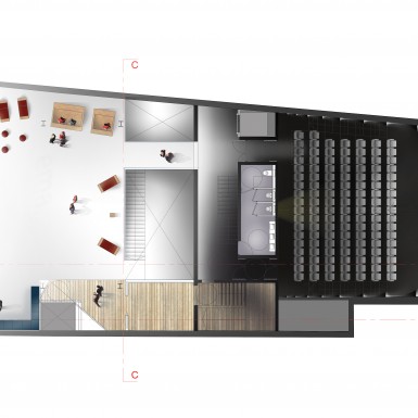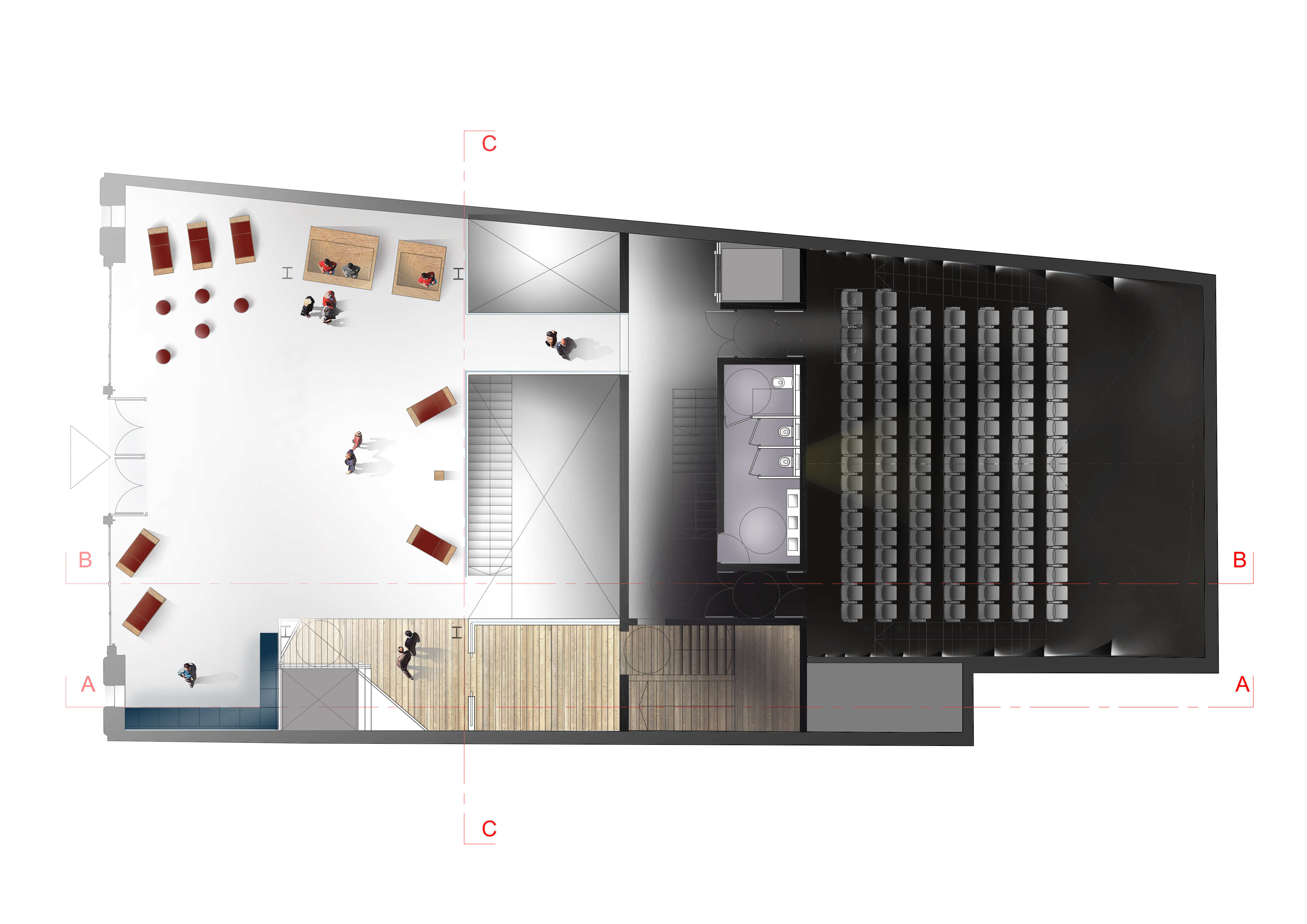 Autant le mur monumental aveugle cachant les salles s’impose par sa présence dans l’espace autant le bloc de l’entrée, inondé de lumière grâce à la façade historique vitrée et la faille centrale s’ouvre et s’efface avec élégance dans un souci de transparence. Ici le travail de l’architecture se fait immatériel. Ce symétrique inversé traduit une orientation vers des usages complémentaires et jusqu’à présent inédits pour un cinéma. Avec un plateau de 160m² laissé libre de toute cloison, l’espace d’accueil exprime le changement de paradigme du cinéma : autrefois cantonné à la gestion de flux dans les cinémas traditionnels, ce lieu devenu propre intègre la notion de mobilité : le plateau verra ainsi s’installer une ressourcerie qui proposera la vente éphémère d’objets récupéré sur les tournages, ainsi que des stands temporaires en lien avec la programmation du moment. Cet espace sera investi et co-modelé par ses usagers : les « autos-visionneuses » seront autant de médiathèques numériques sur roulettes. Elles pourront s’assembler afin de regrouper des tribus d’amis, des couples de seniors et/ou d’amoureux, des classes en visite, le clan familial ou simplement rester isolées pour l’utilisateur solitaire.