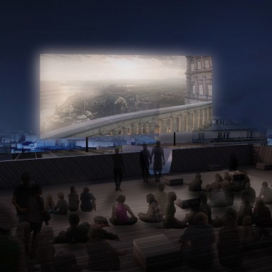 L’odeur du popcorn et des sucreries du stand mobile de friandises signaliseront l’entrée laissée libre de porte. Cette façade intérieure garantit au spectateur l’expérience intime de la projection et son anonymat et rend possible une immersion cinématographique en société de qualité.