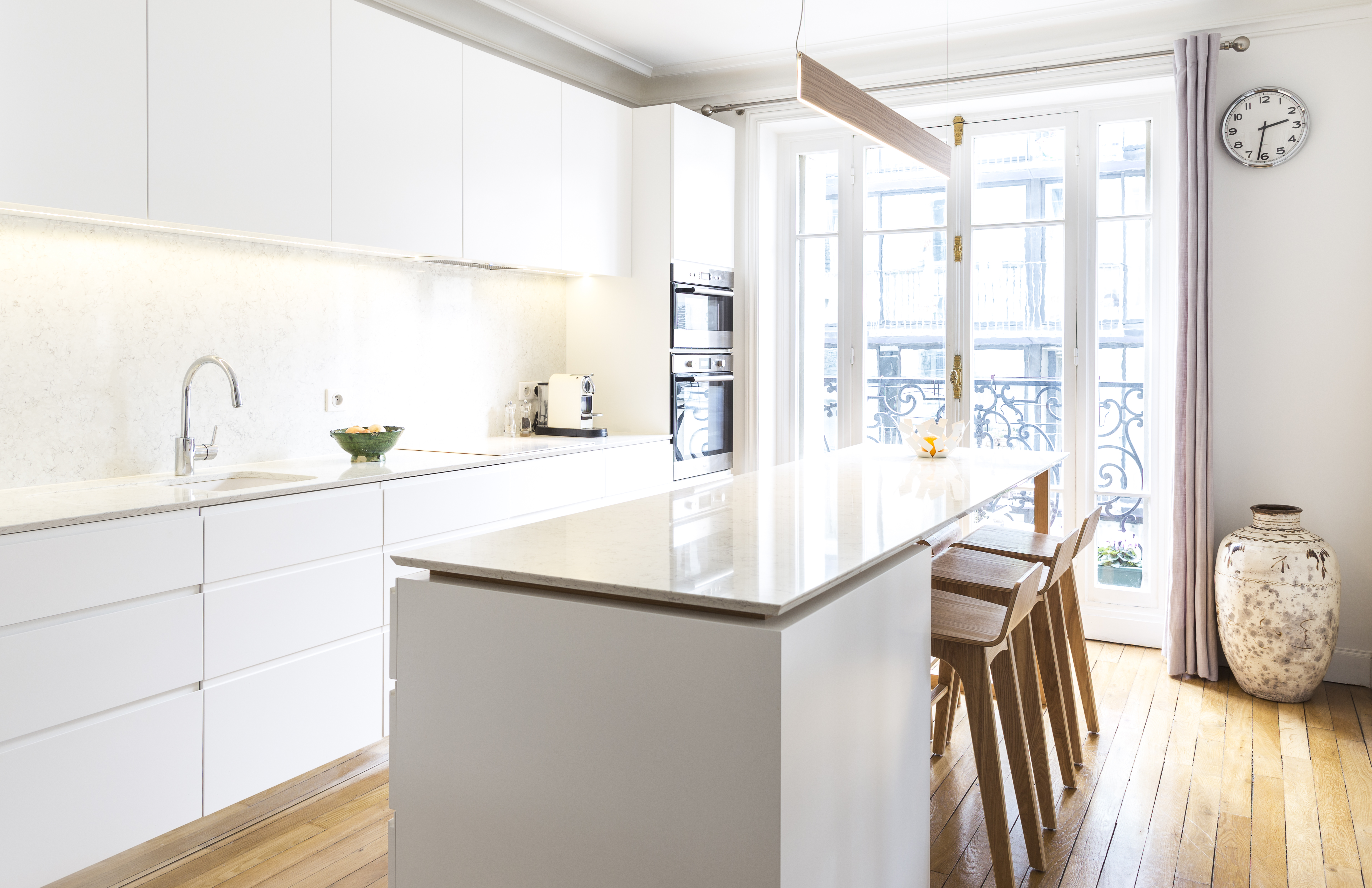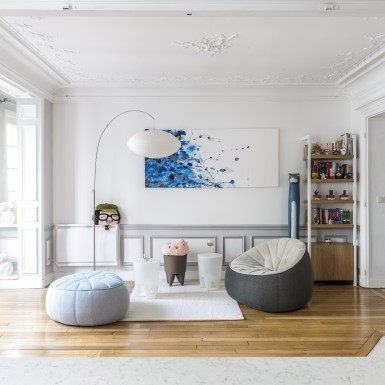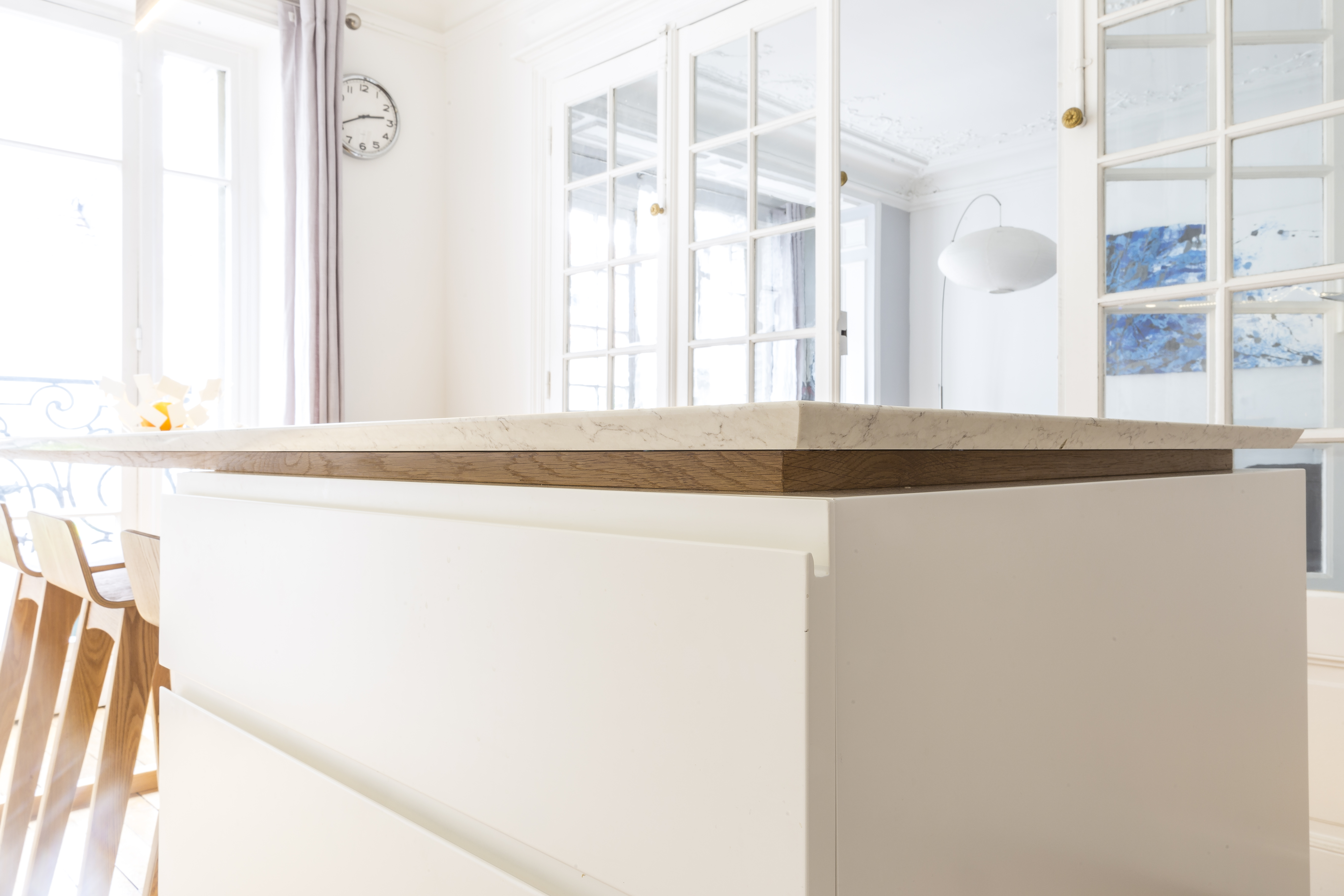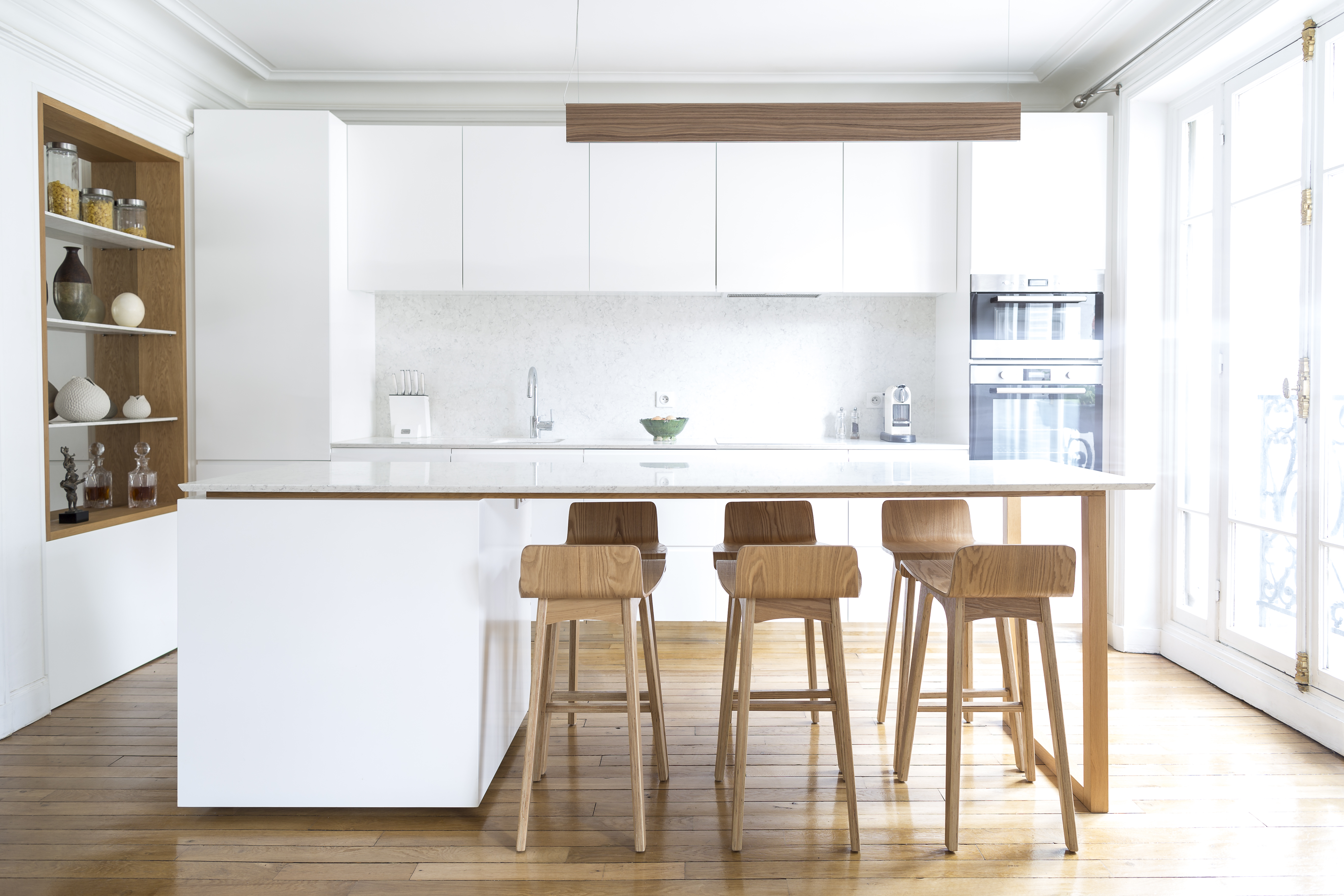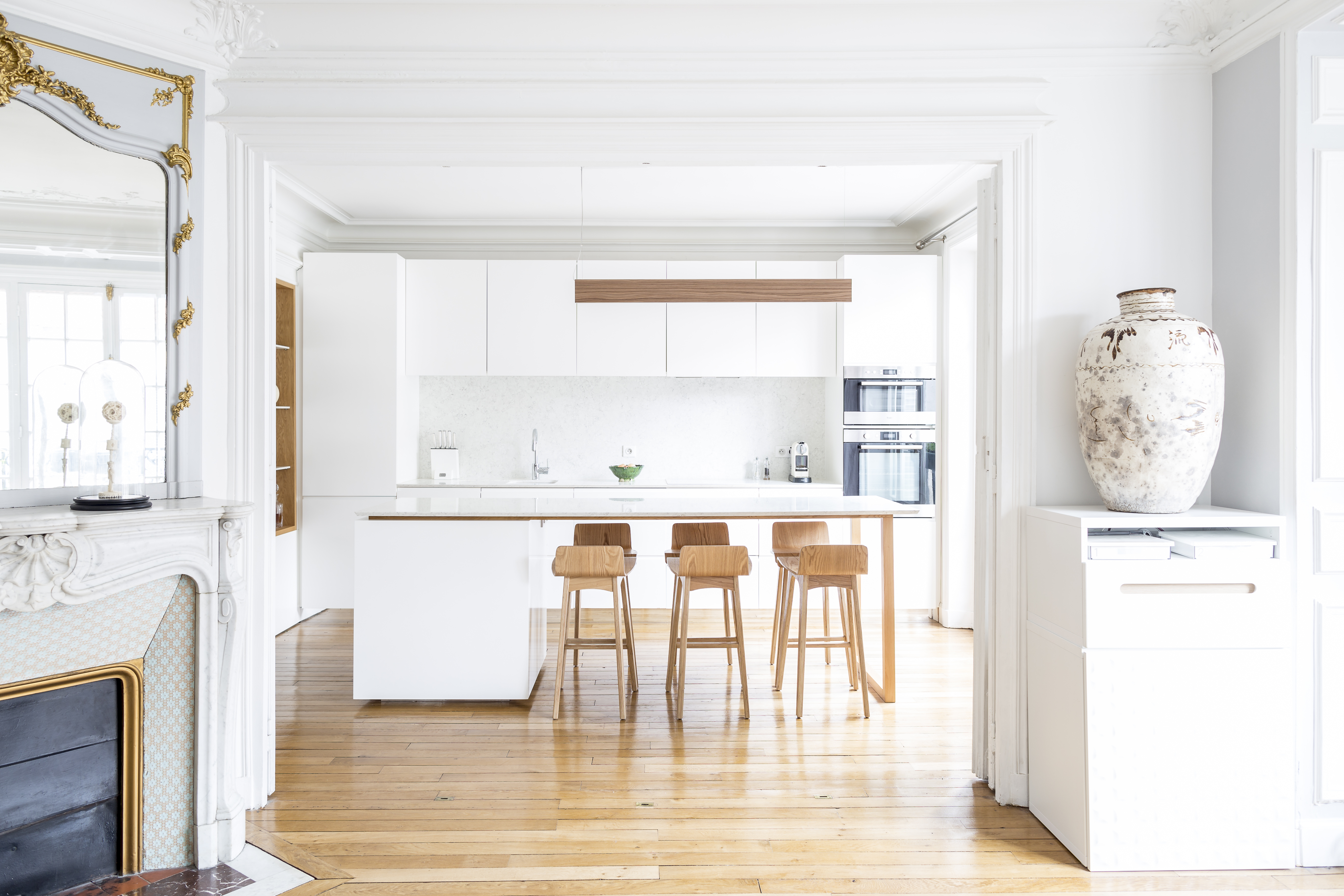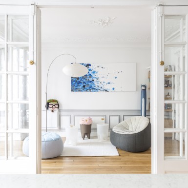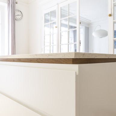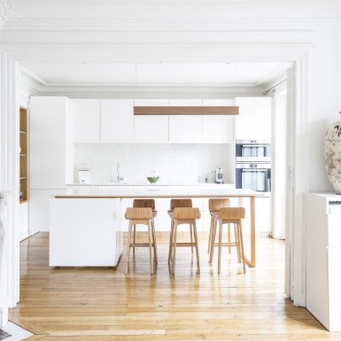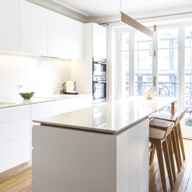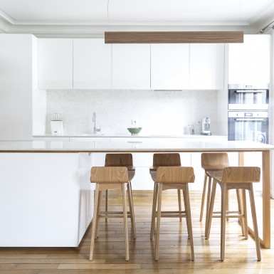 L’appartement a été entièrement repensé afin d’avoir 2 grandes chambres et un bel espace à vivre. Le défi était de réussir à intégrer une cuisine dans ce double séjour haussmannien. La sobriété du design et le choix des matériaux réinterprète de façon contemporaine les codes de l’haussmannien.