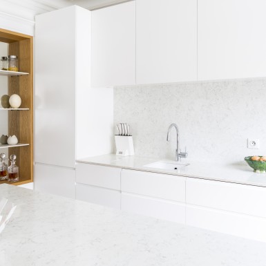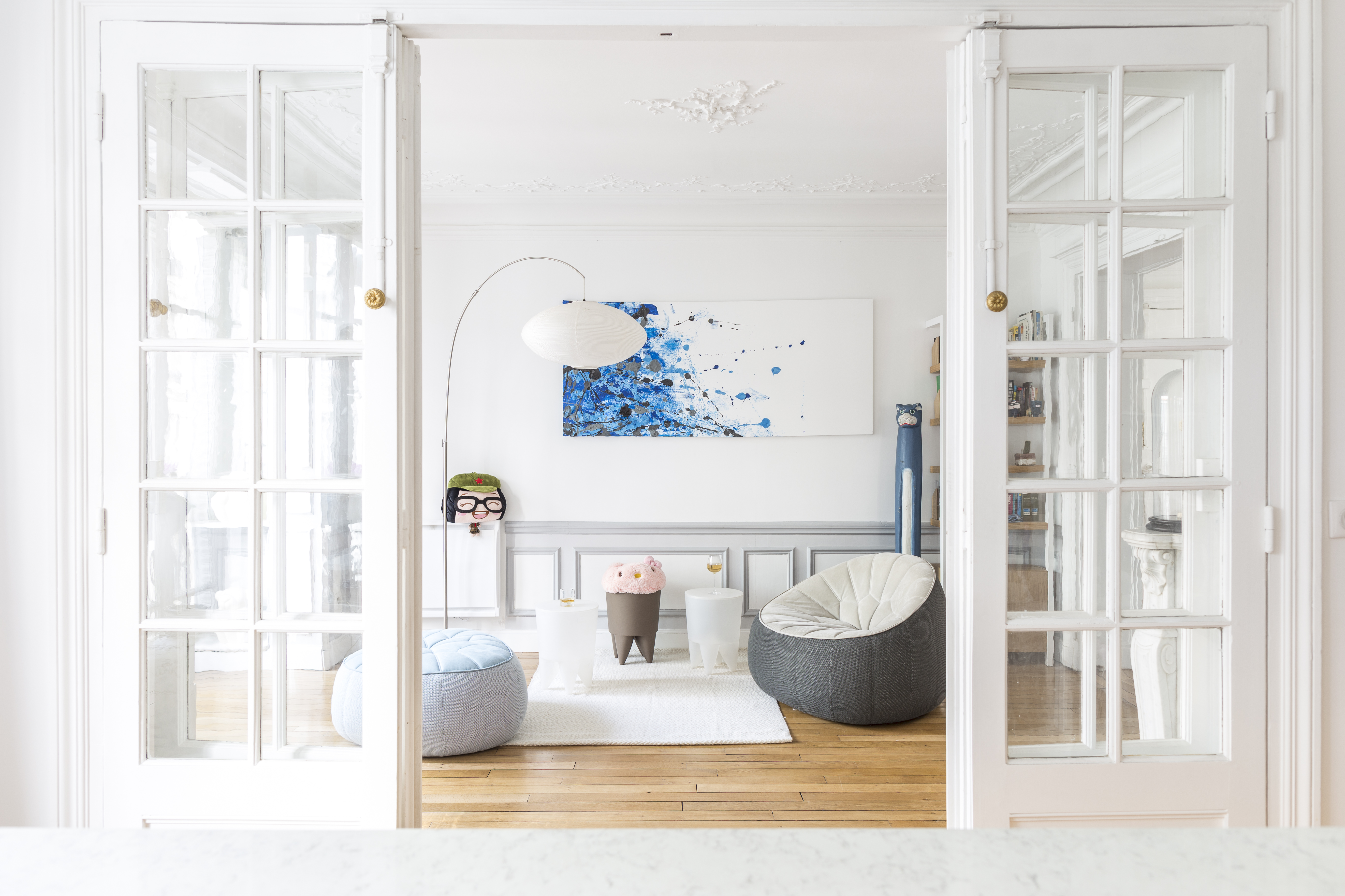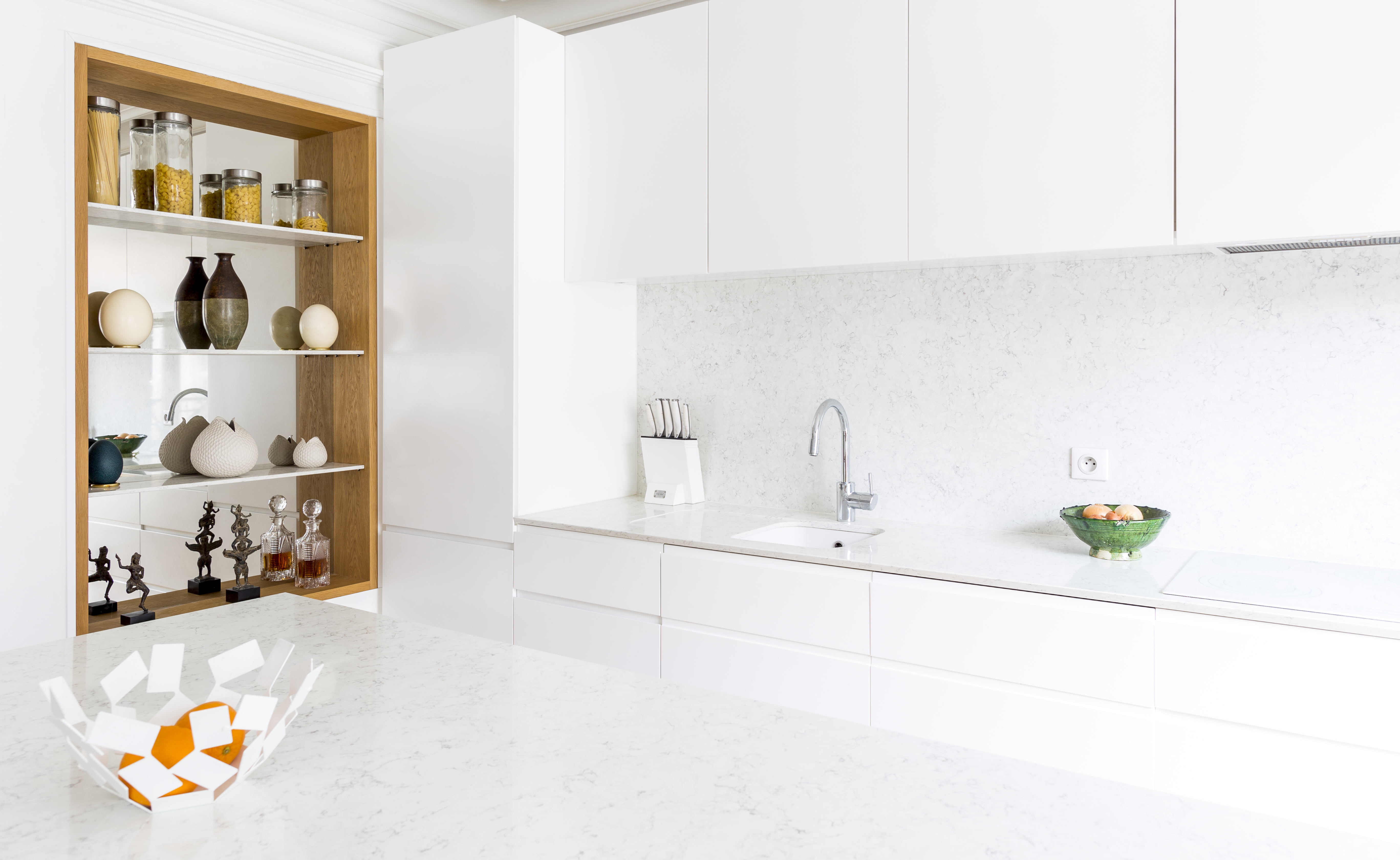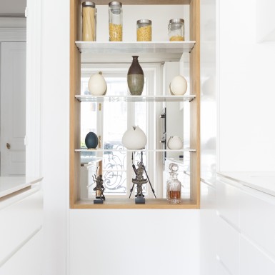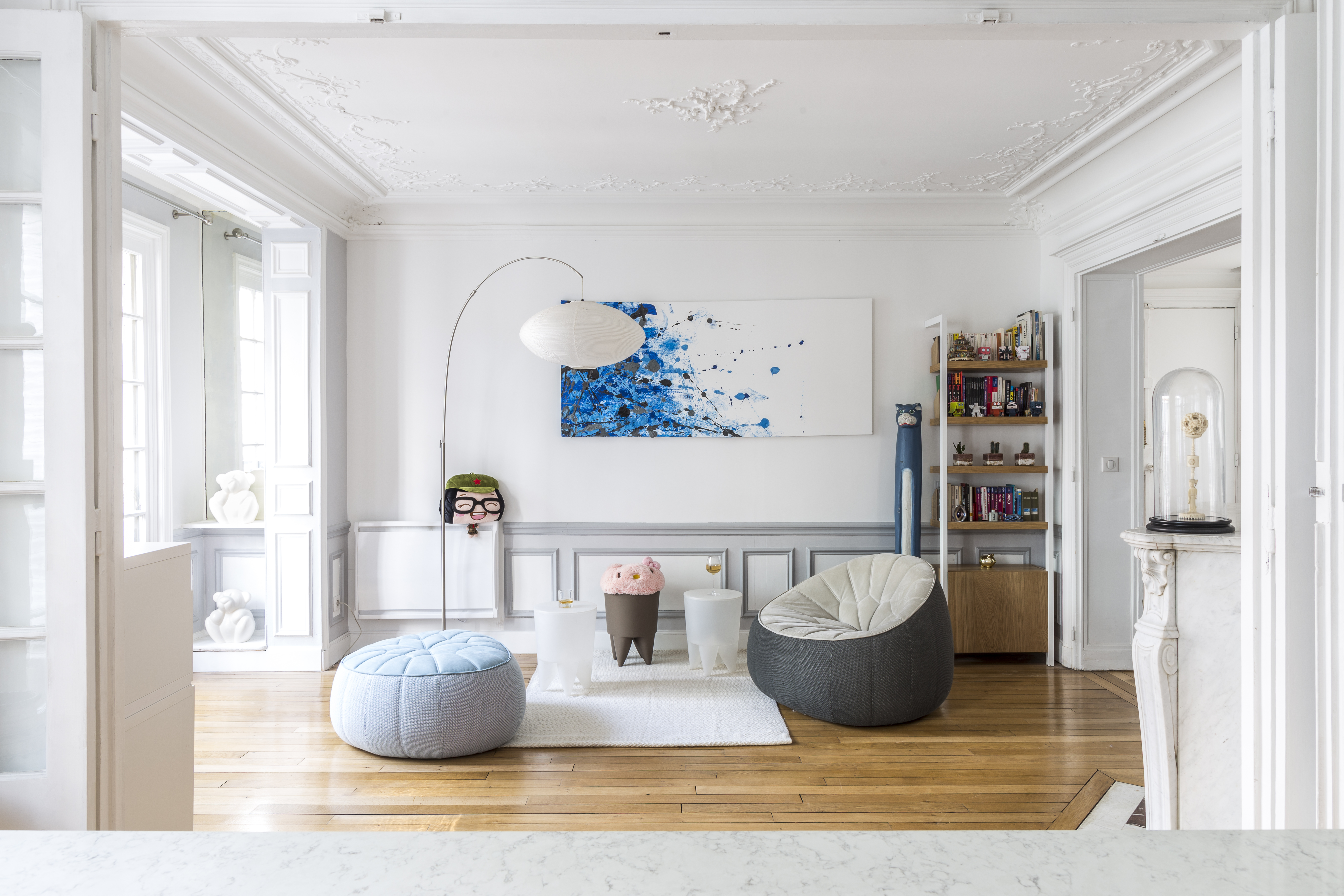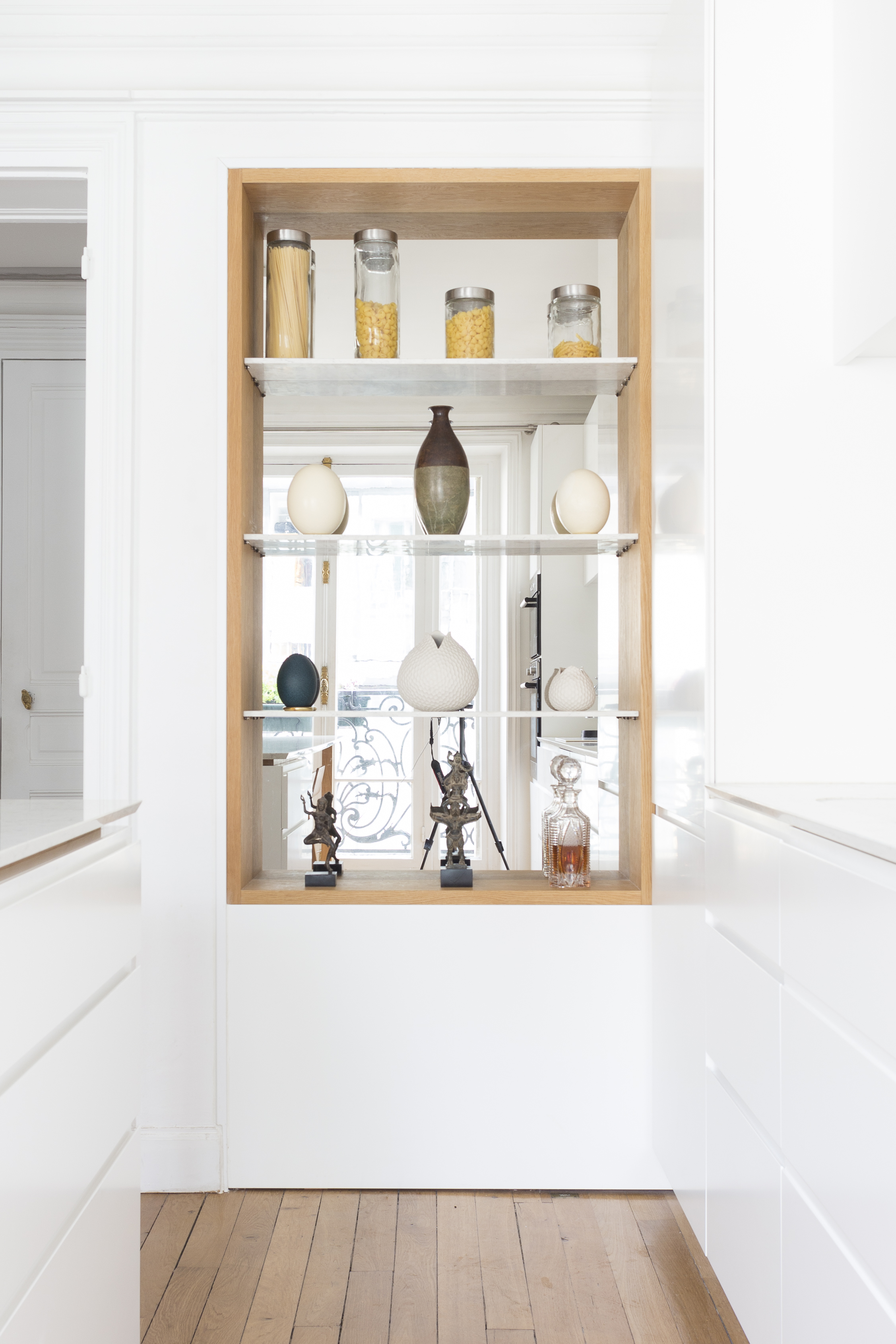 L’appartement a été entièrement repensé afin d’avoir 2 grandes chambres et un bel espace à vivre. Le défi était de réussir à intégrer une cuisine dans ce double séjour haussmannien. La sobriété du design et le choix des matériaux réinterprète de façon contemporaine les codes de l’haussmannien.
