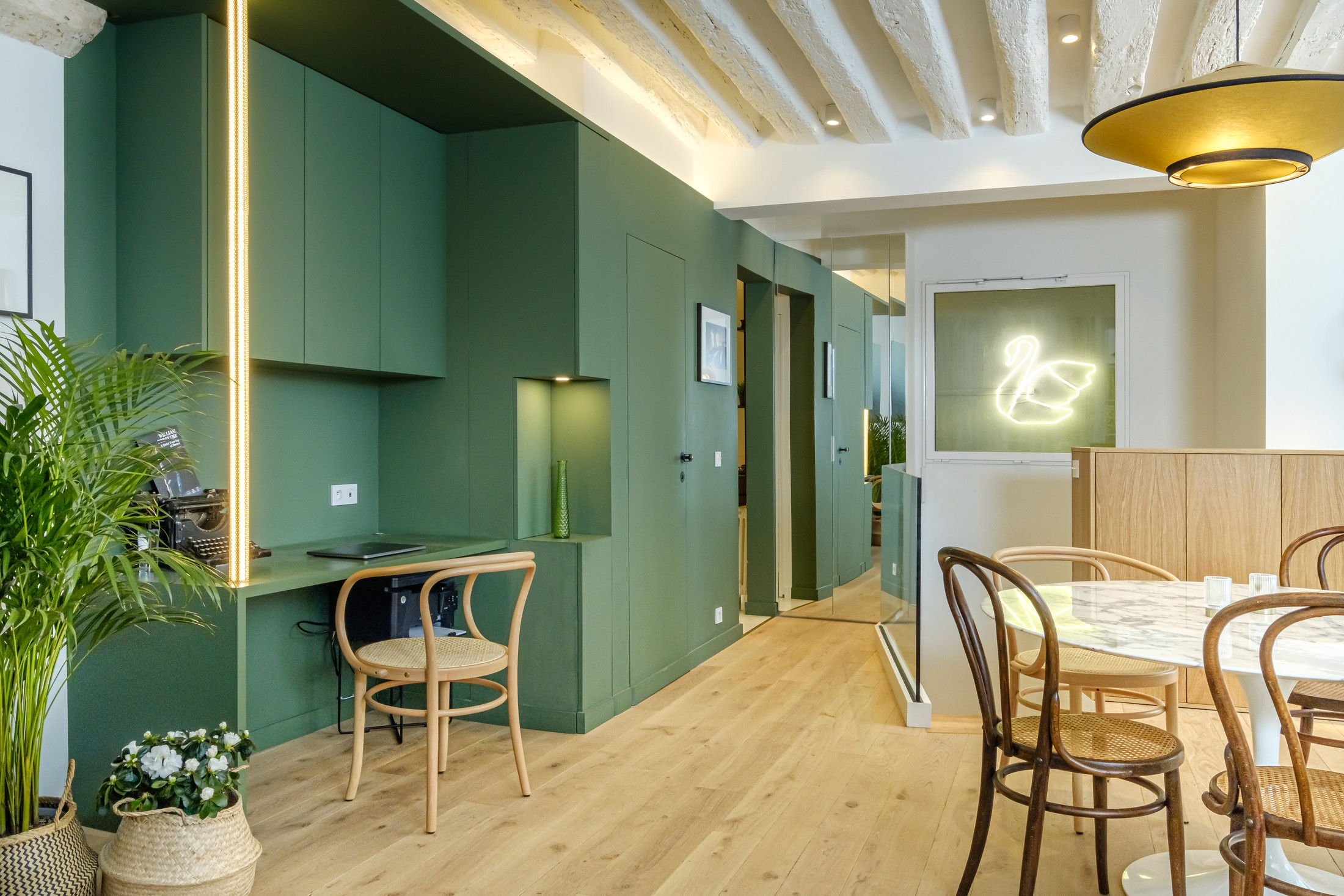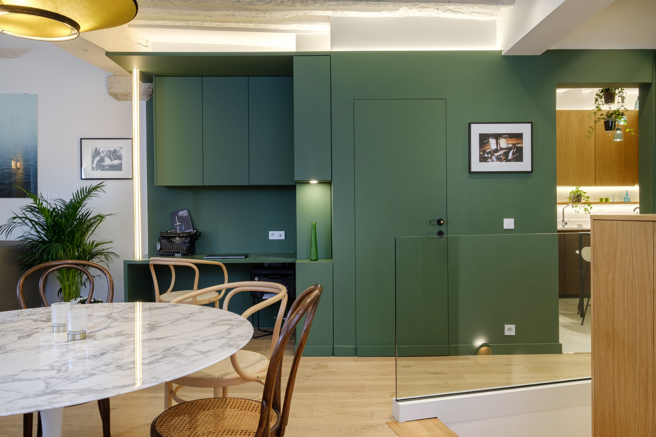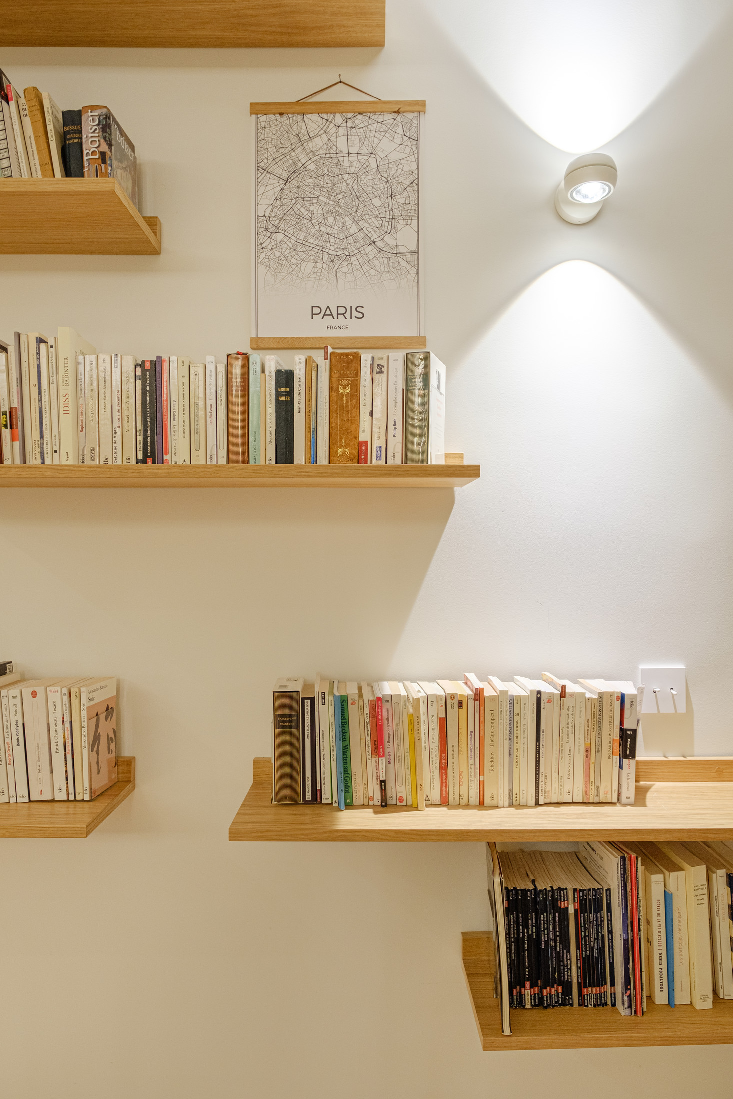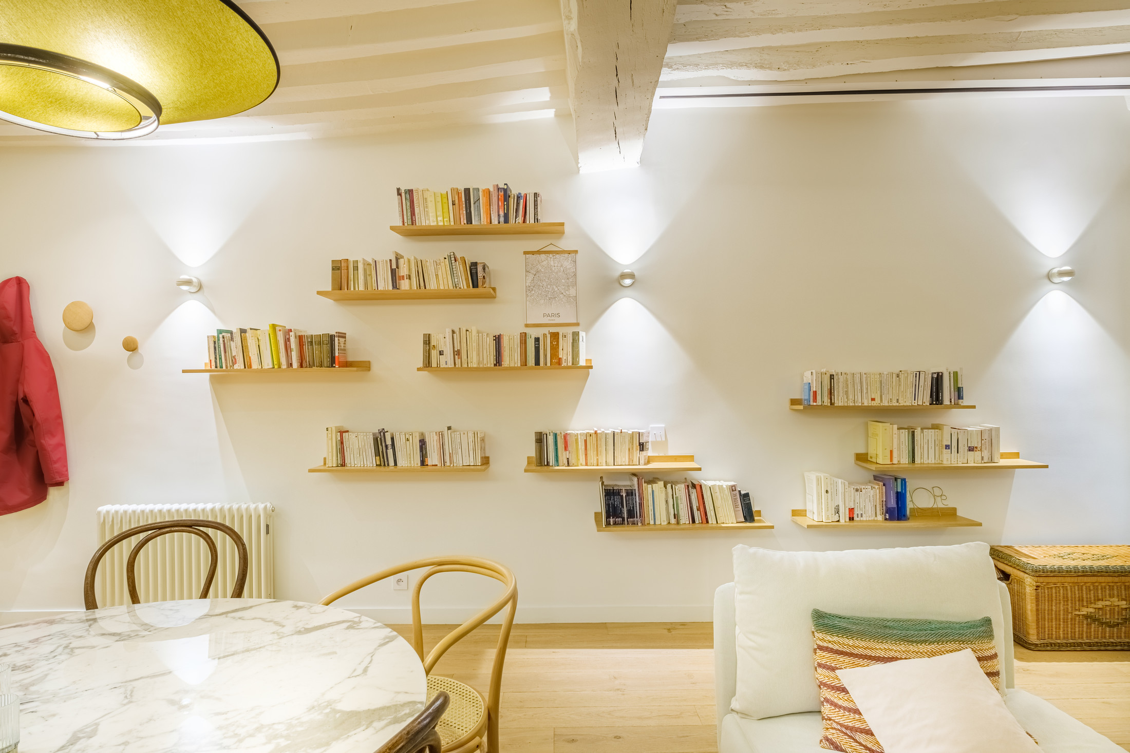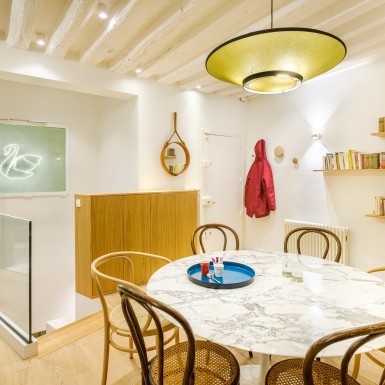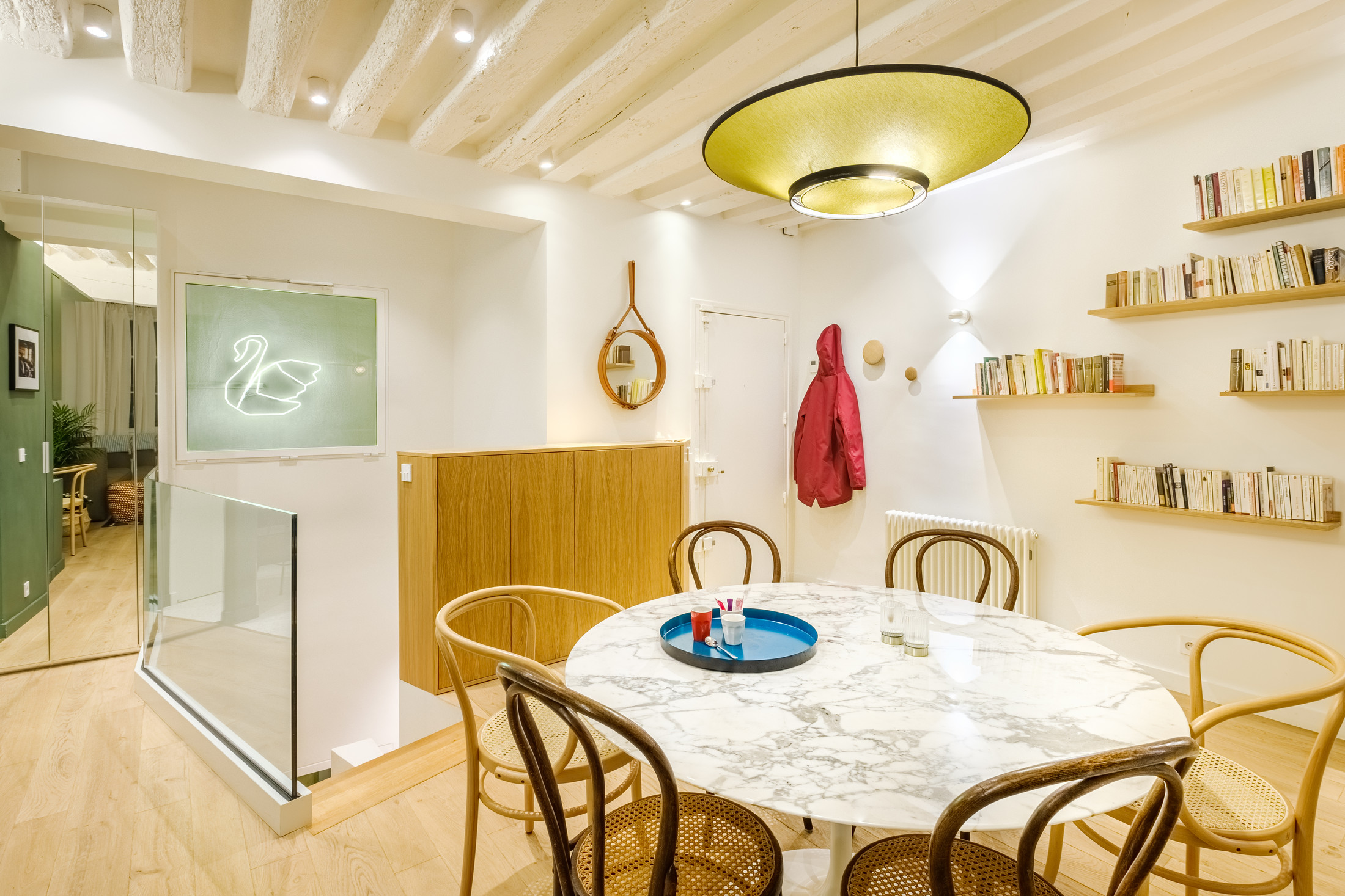 La propriétaire a acheté l’appartement en dessous du sien pour créer un duplex familial de 100m2 à Paris.