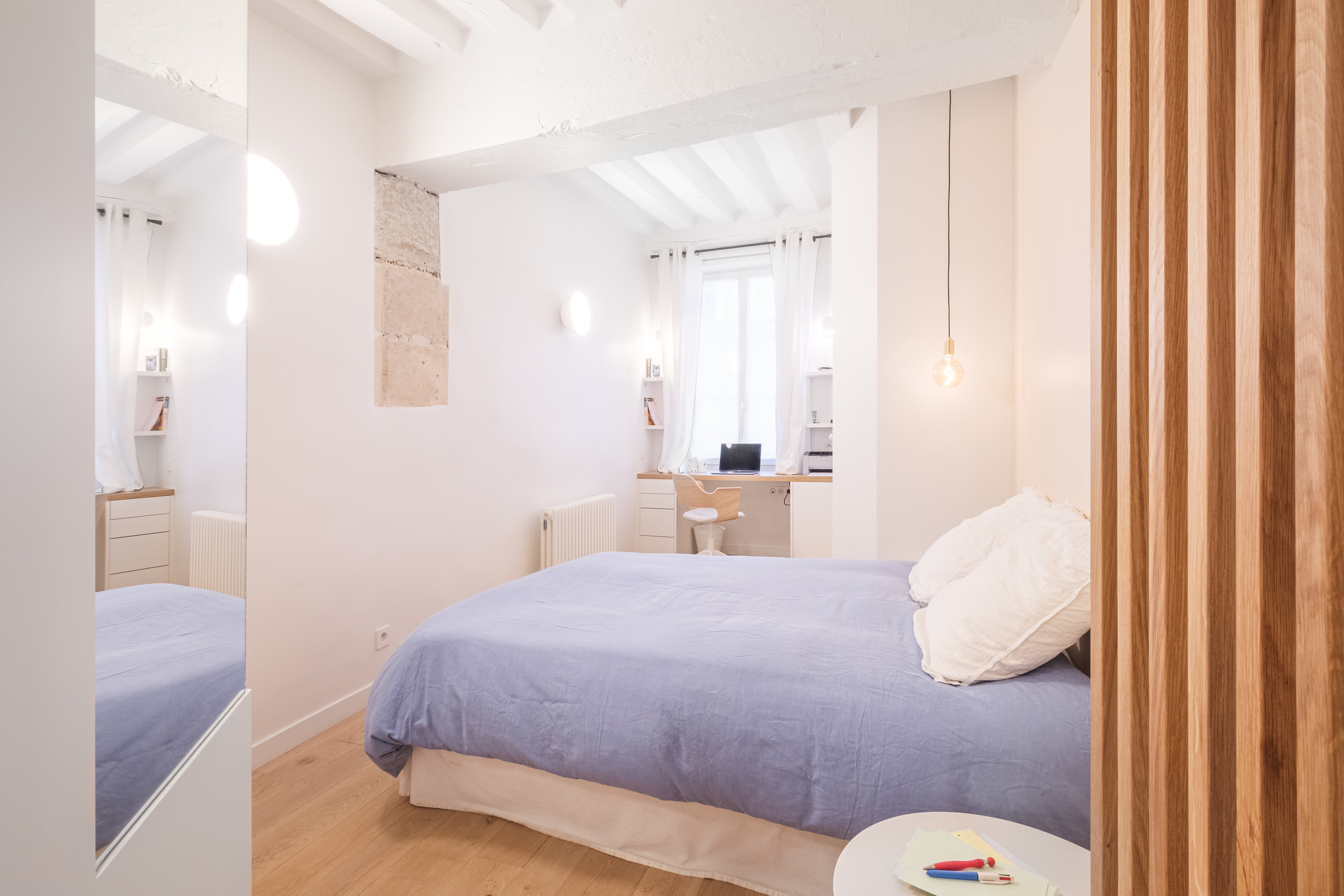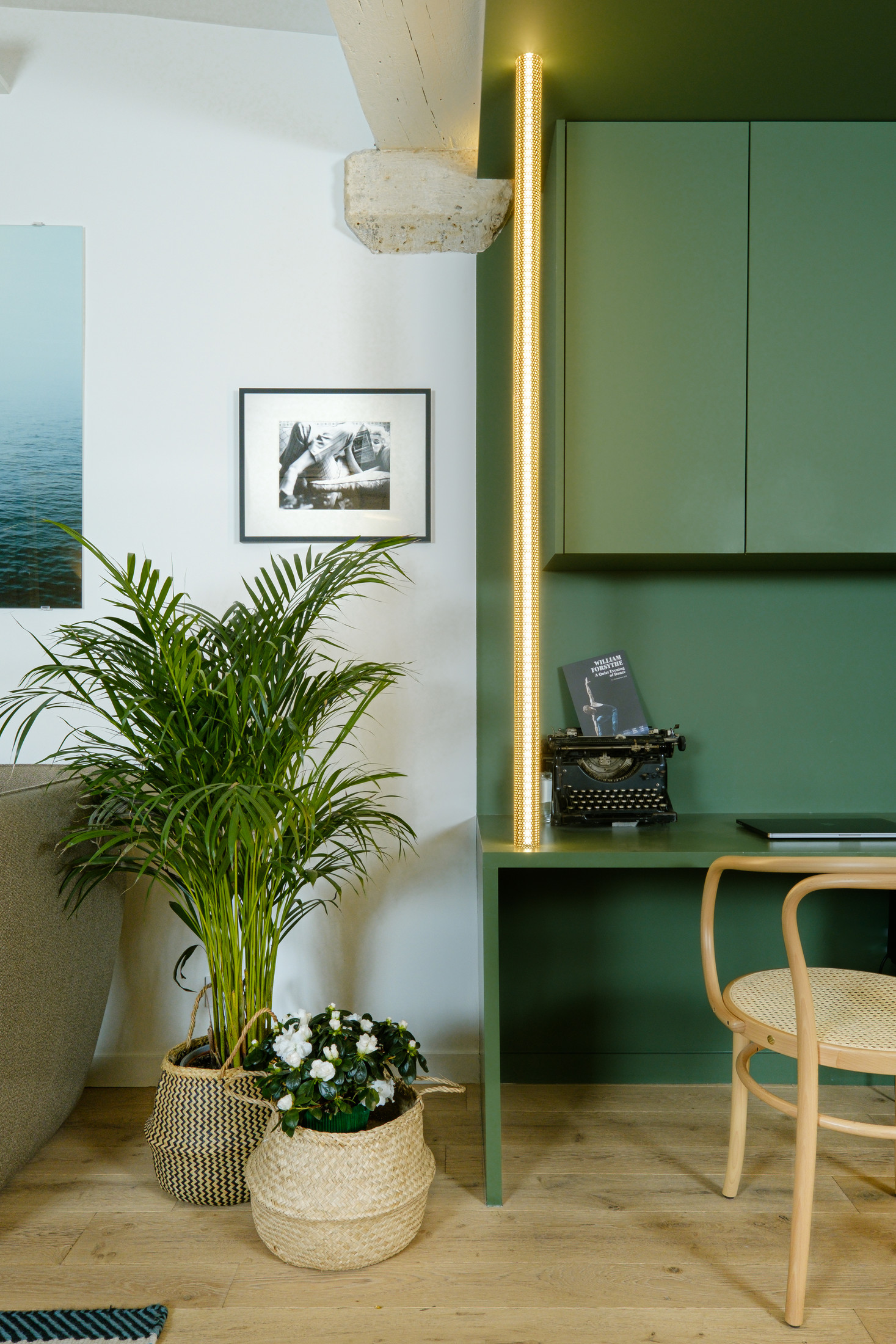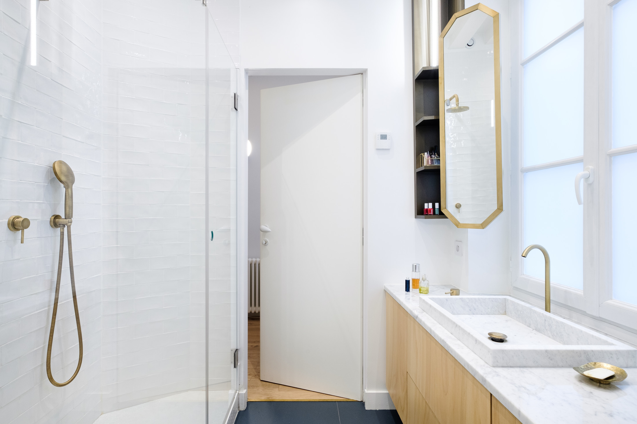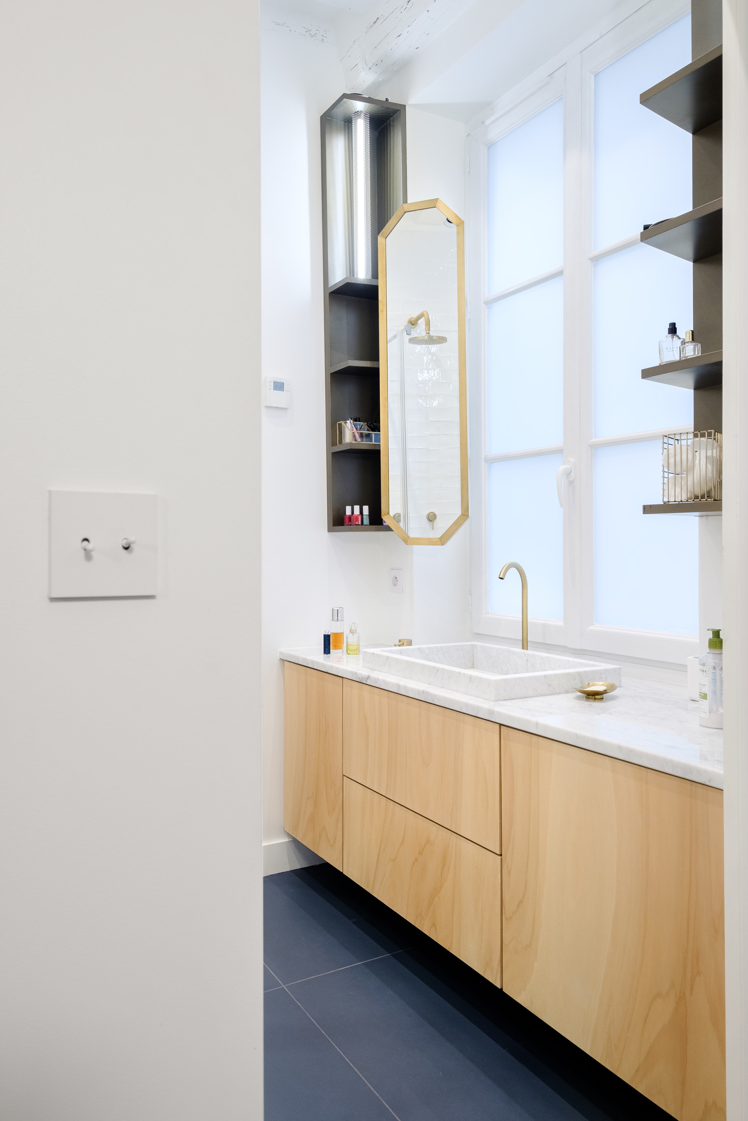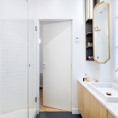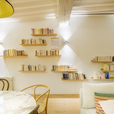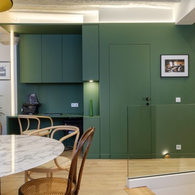 La propriétaire a acheté l’appartement en dessous du sien pour créer un duplex familial de 100m2 à Paris.