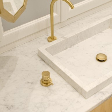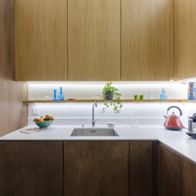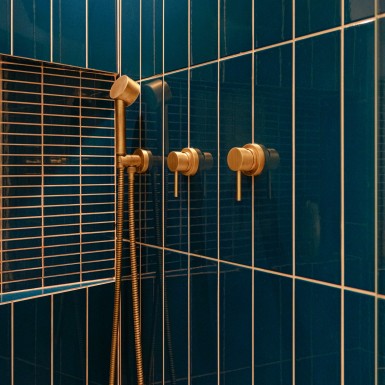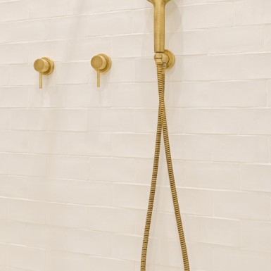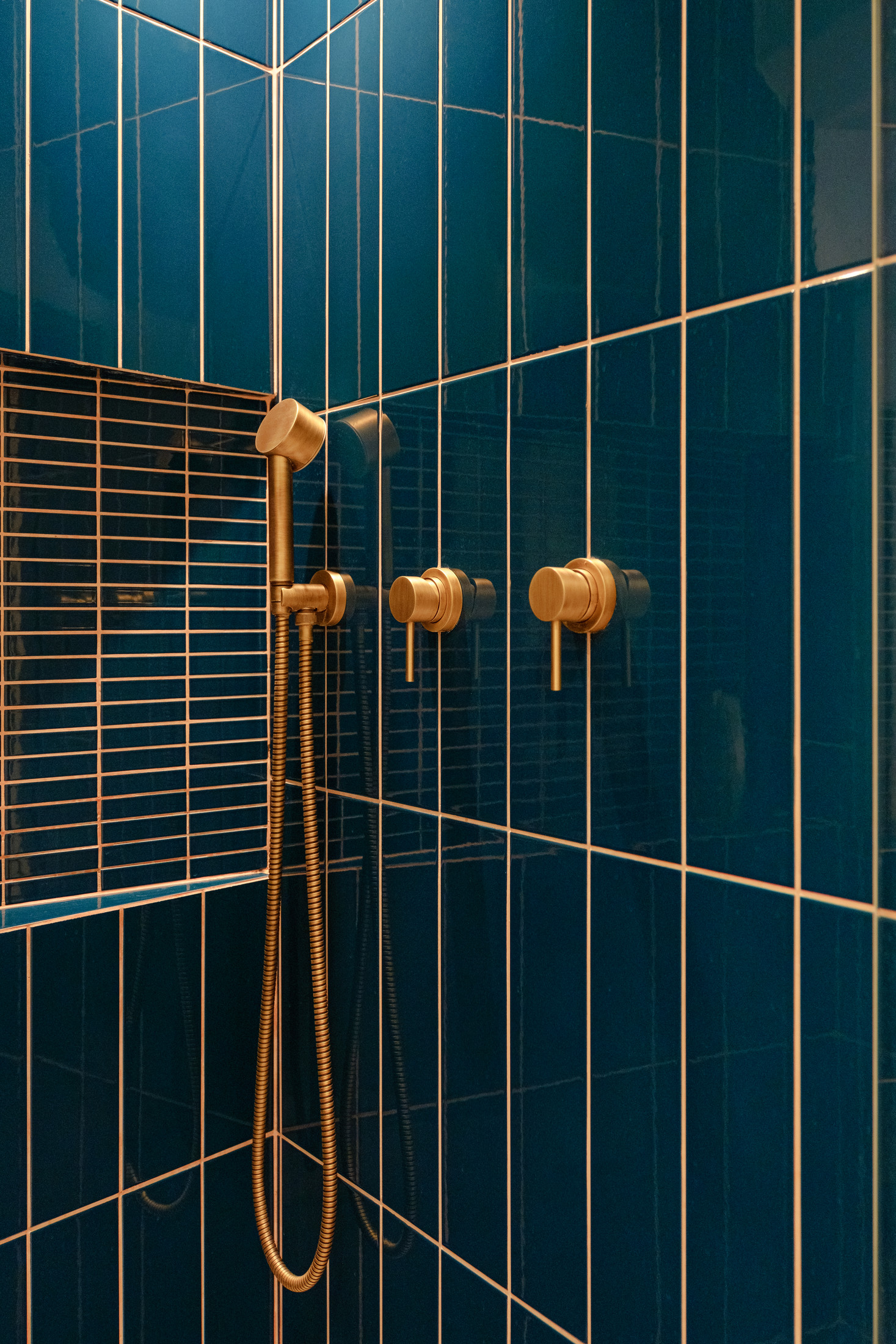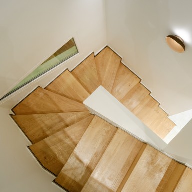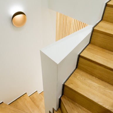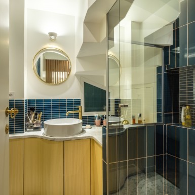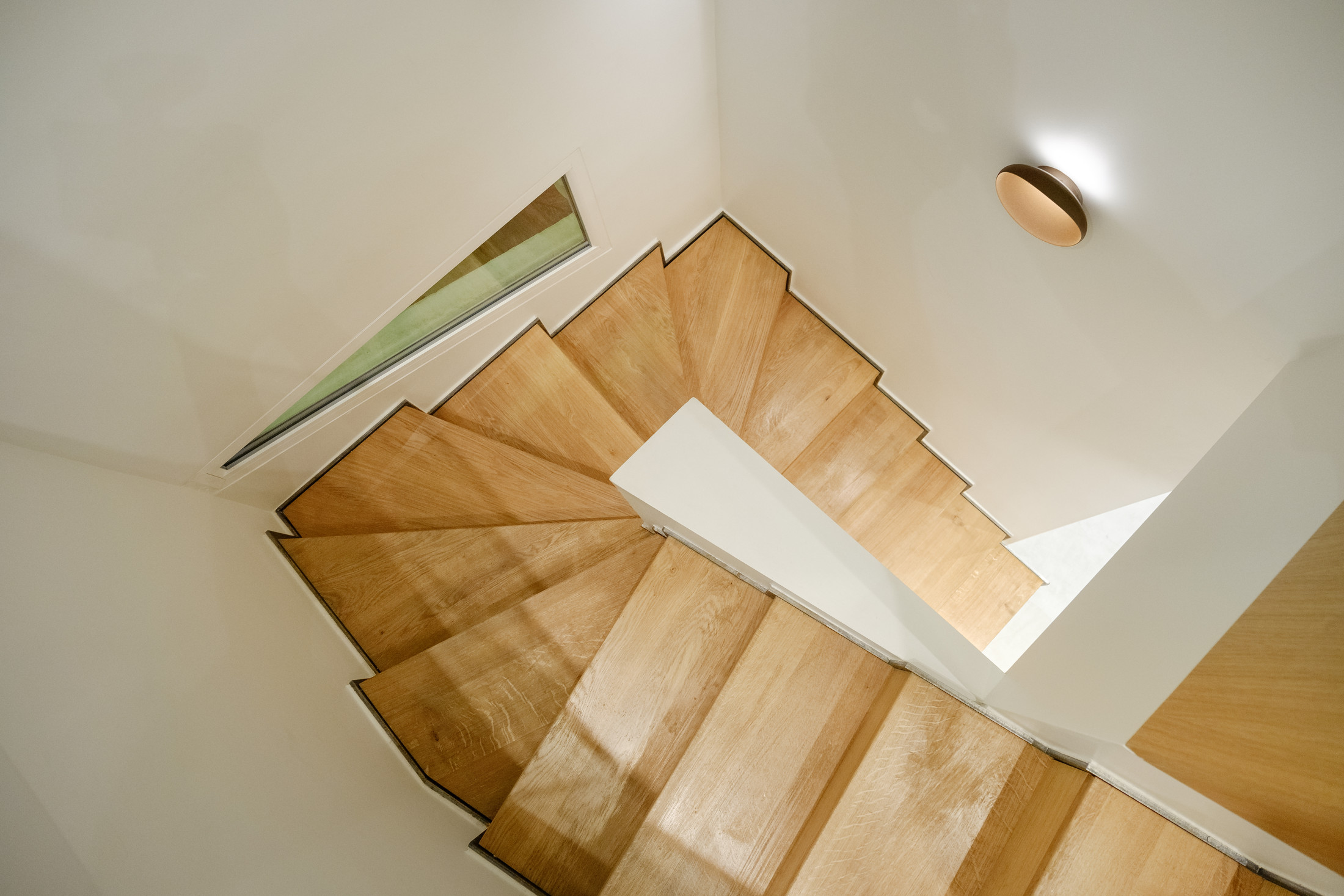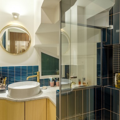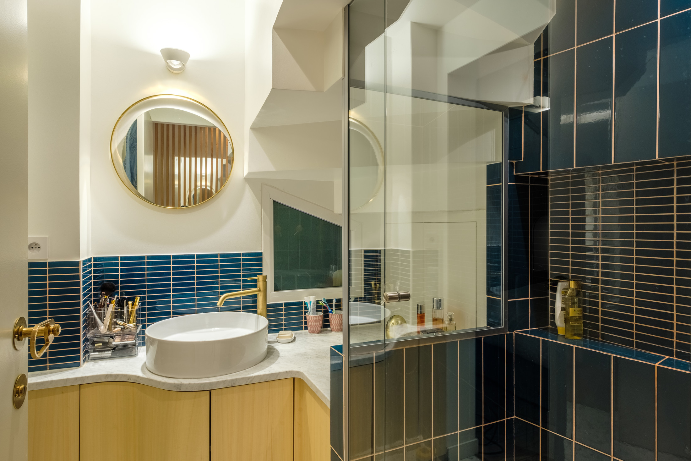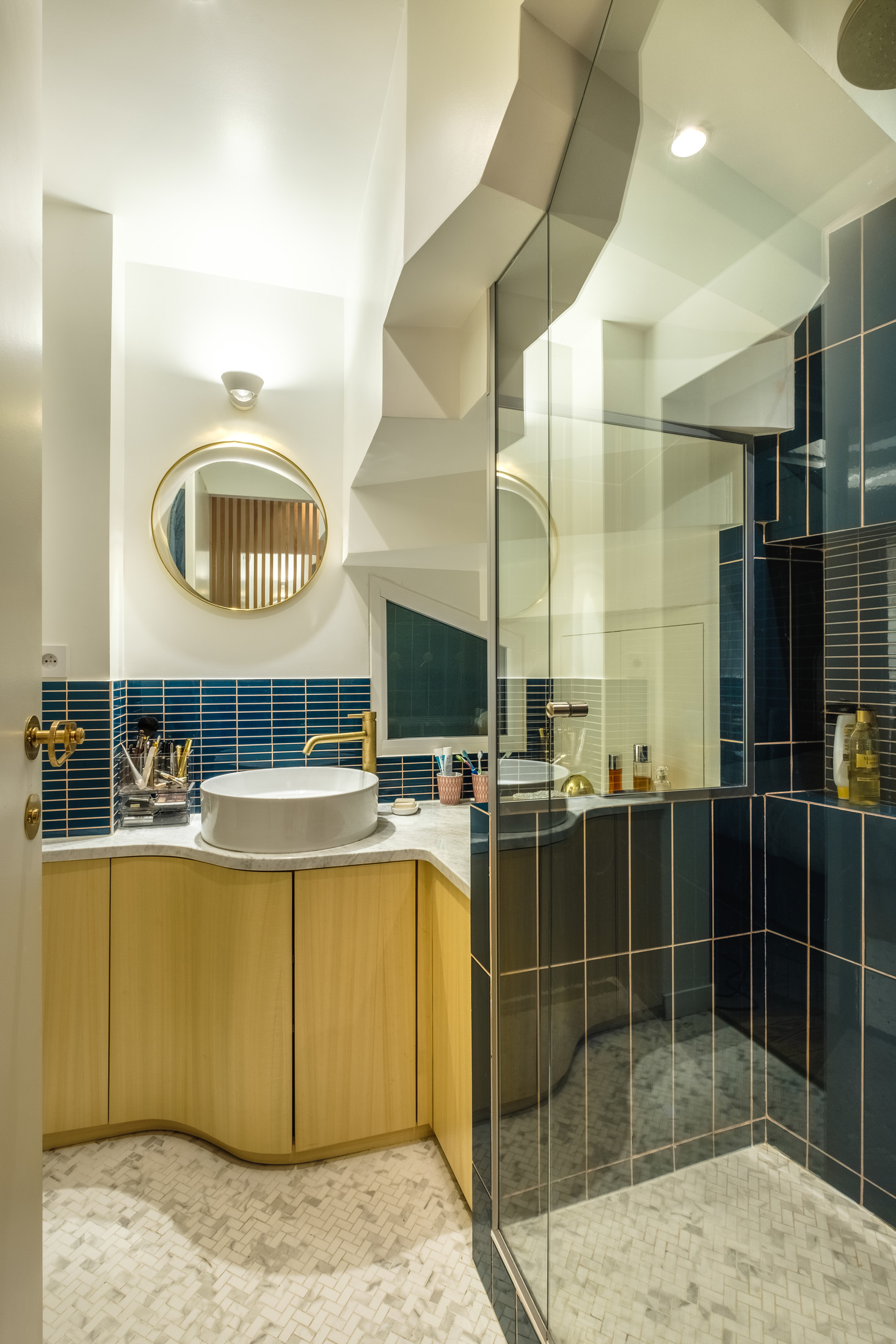 L’espace sous escalier est optimisé avec l’intégration d’une douche et des rangements sous les premières marches.