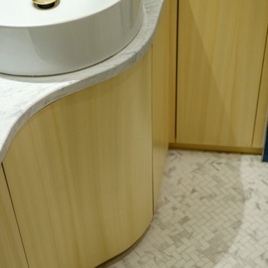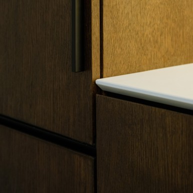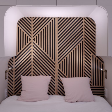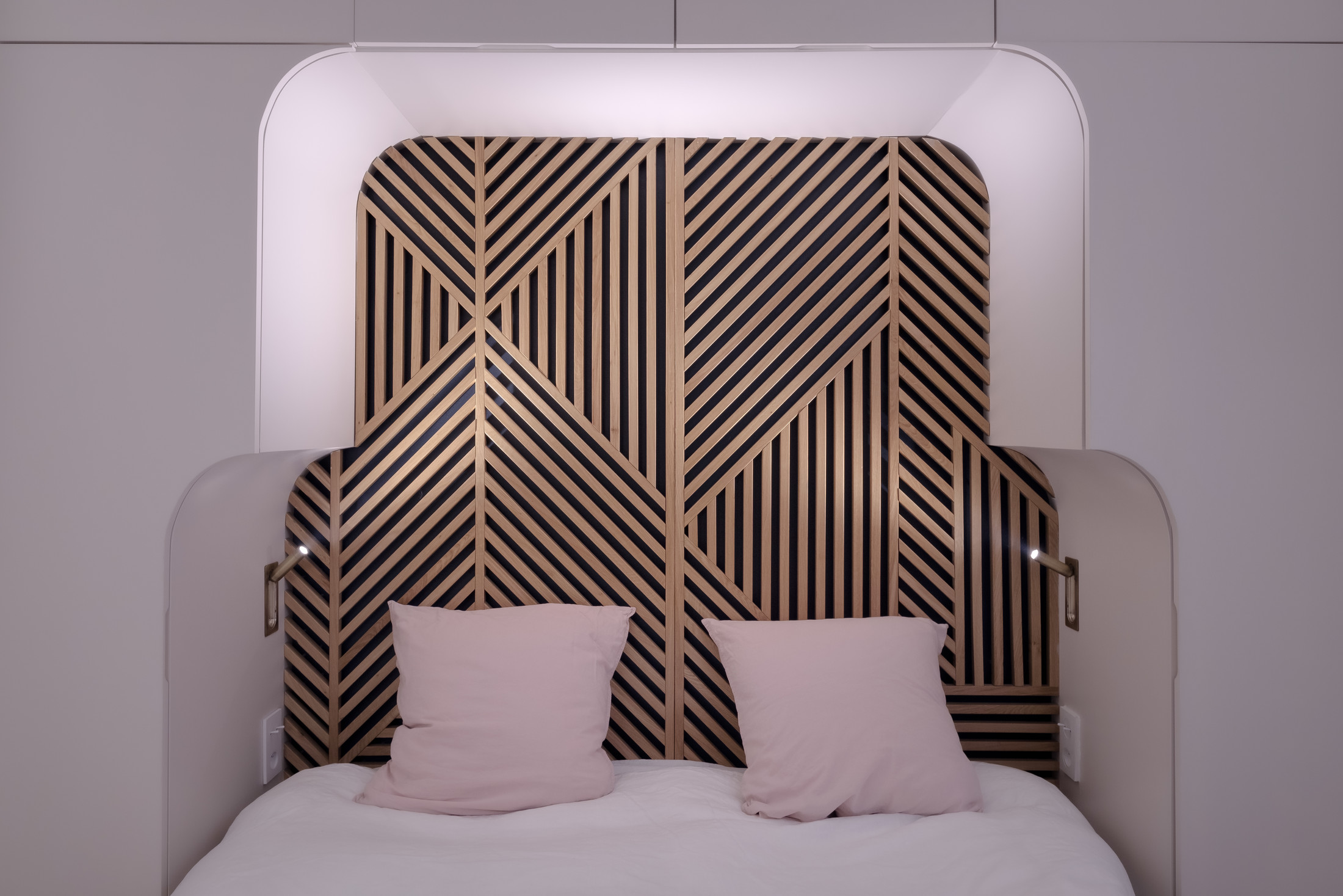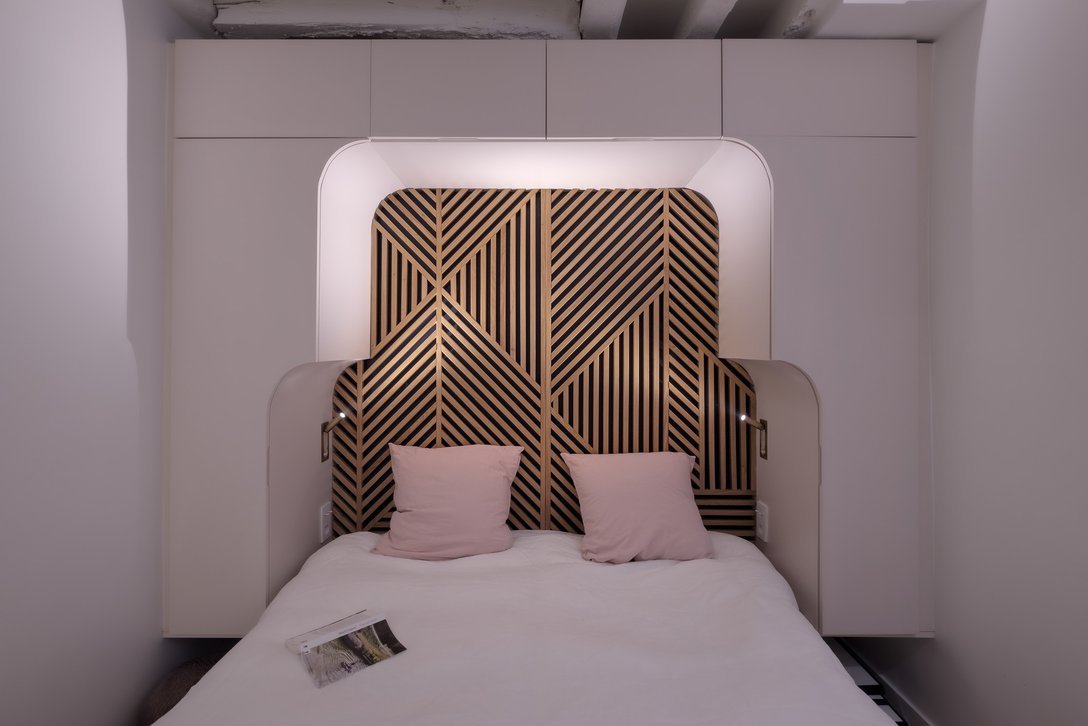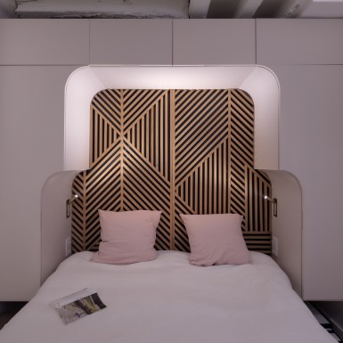 Les portes des chambres et leurs poignées sont dissimulées afin de privilégier l’accès à ses occupants.