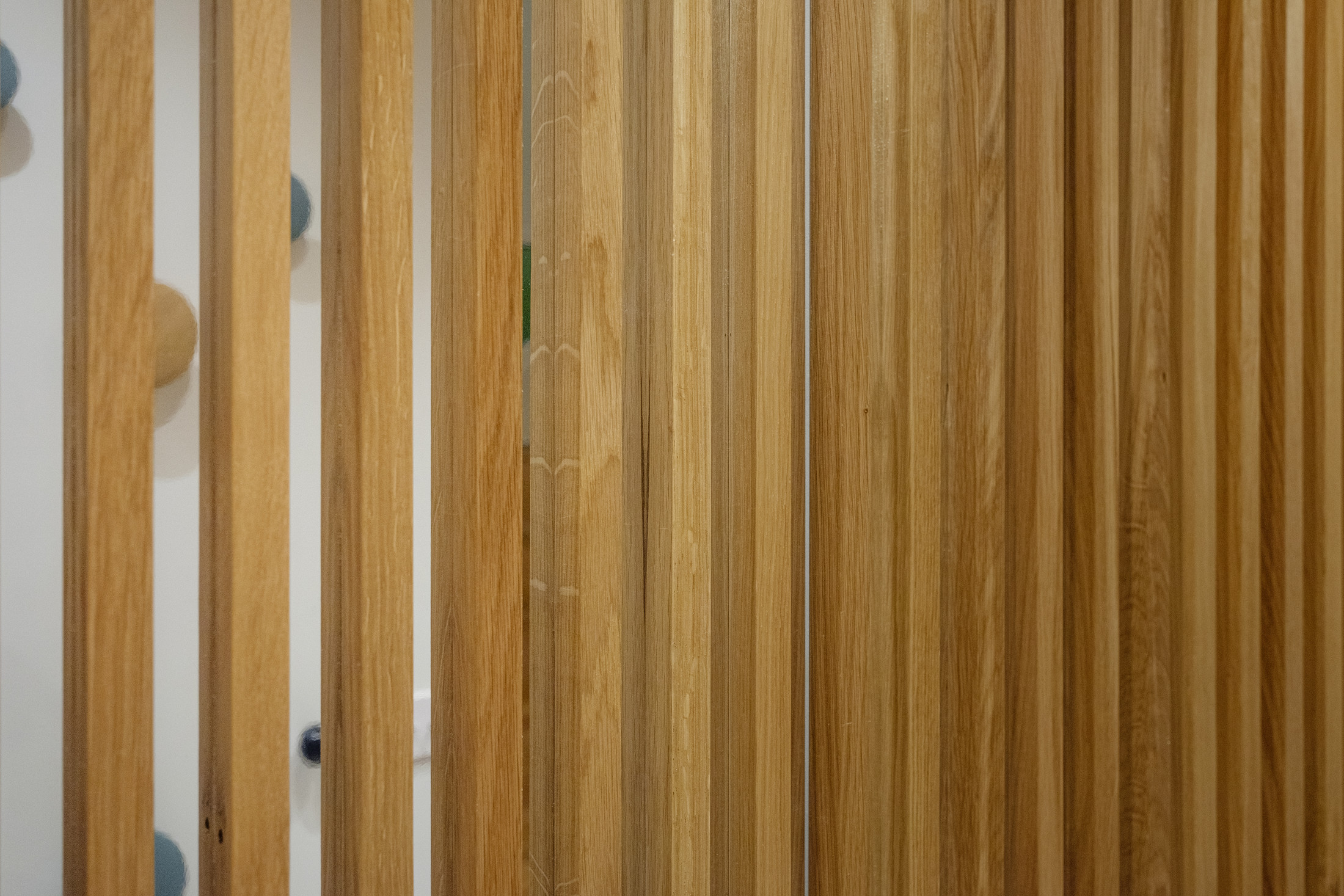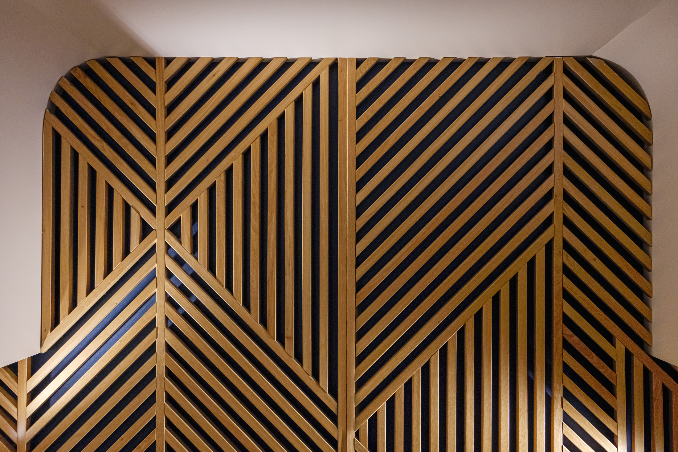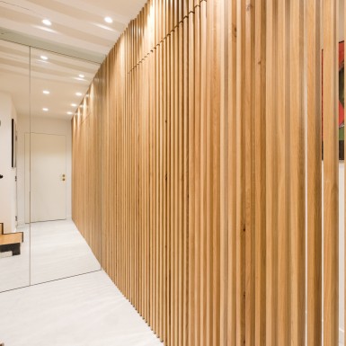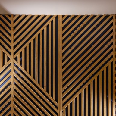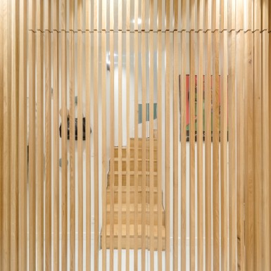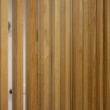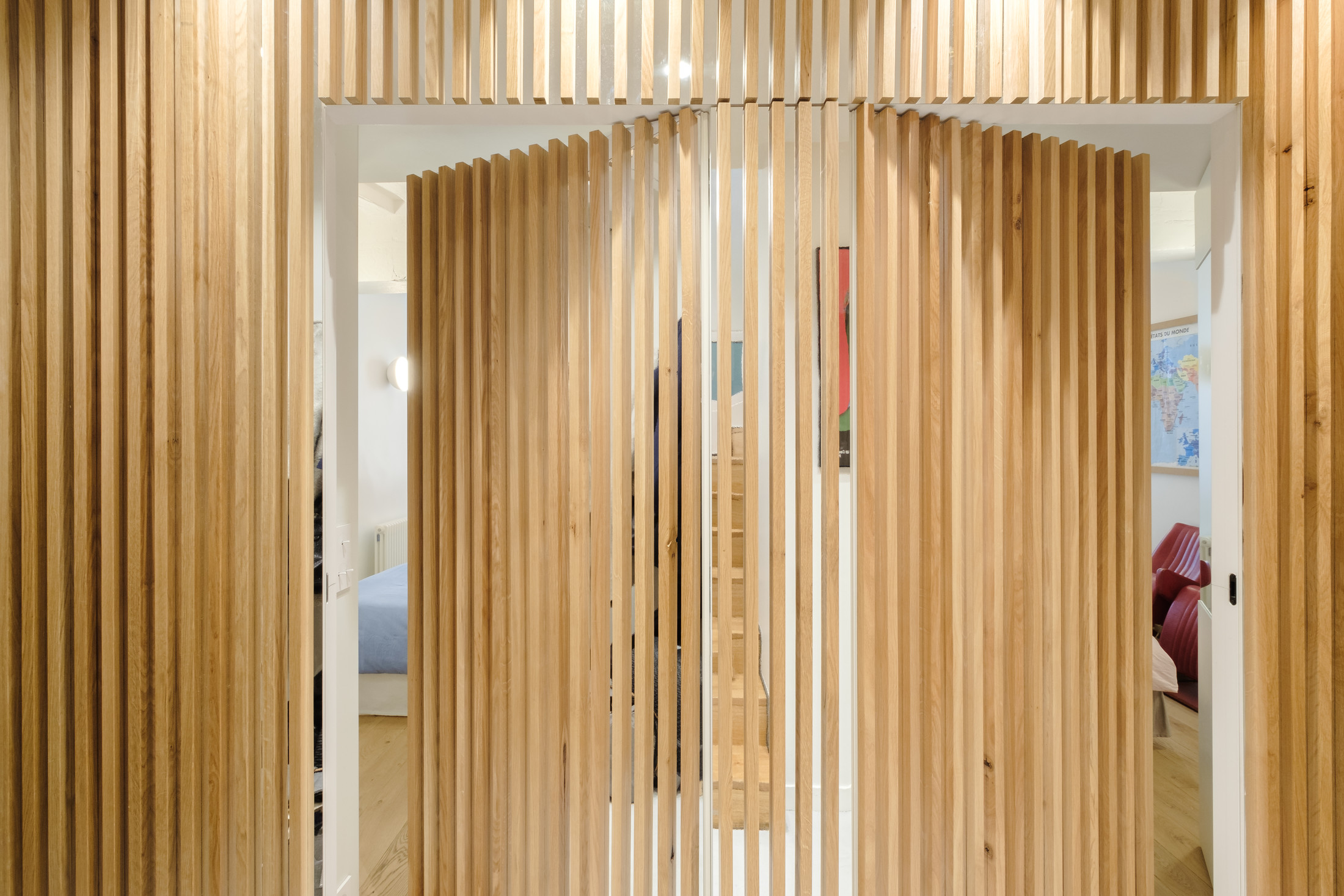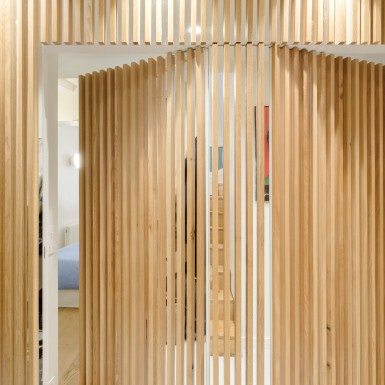Les miroirs entre chaque tasseau en chêne permettent de dématérialiser la cloison en la présentant comme un claustra.