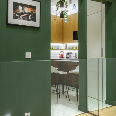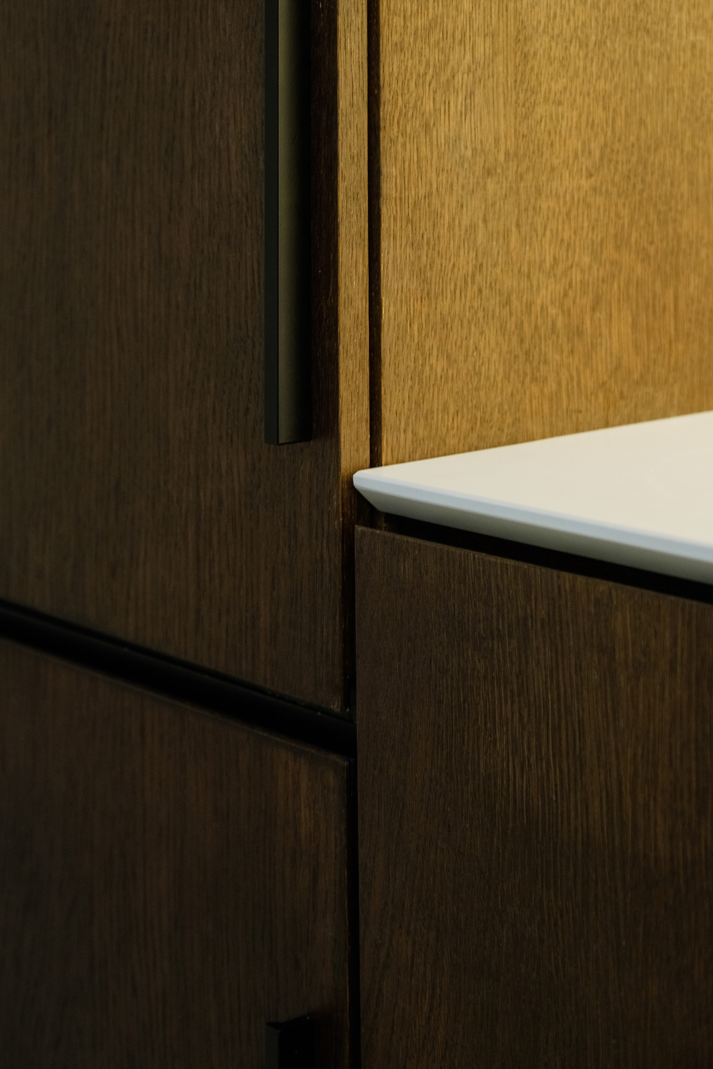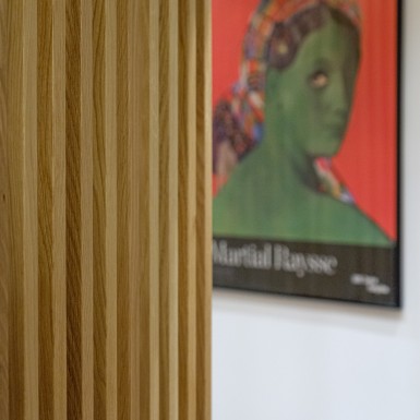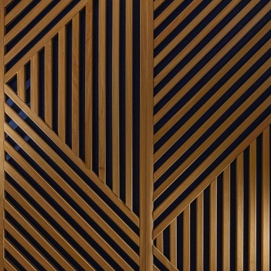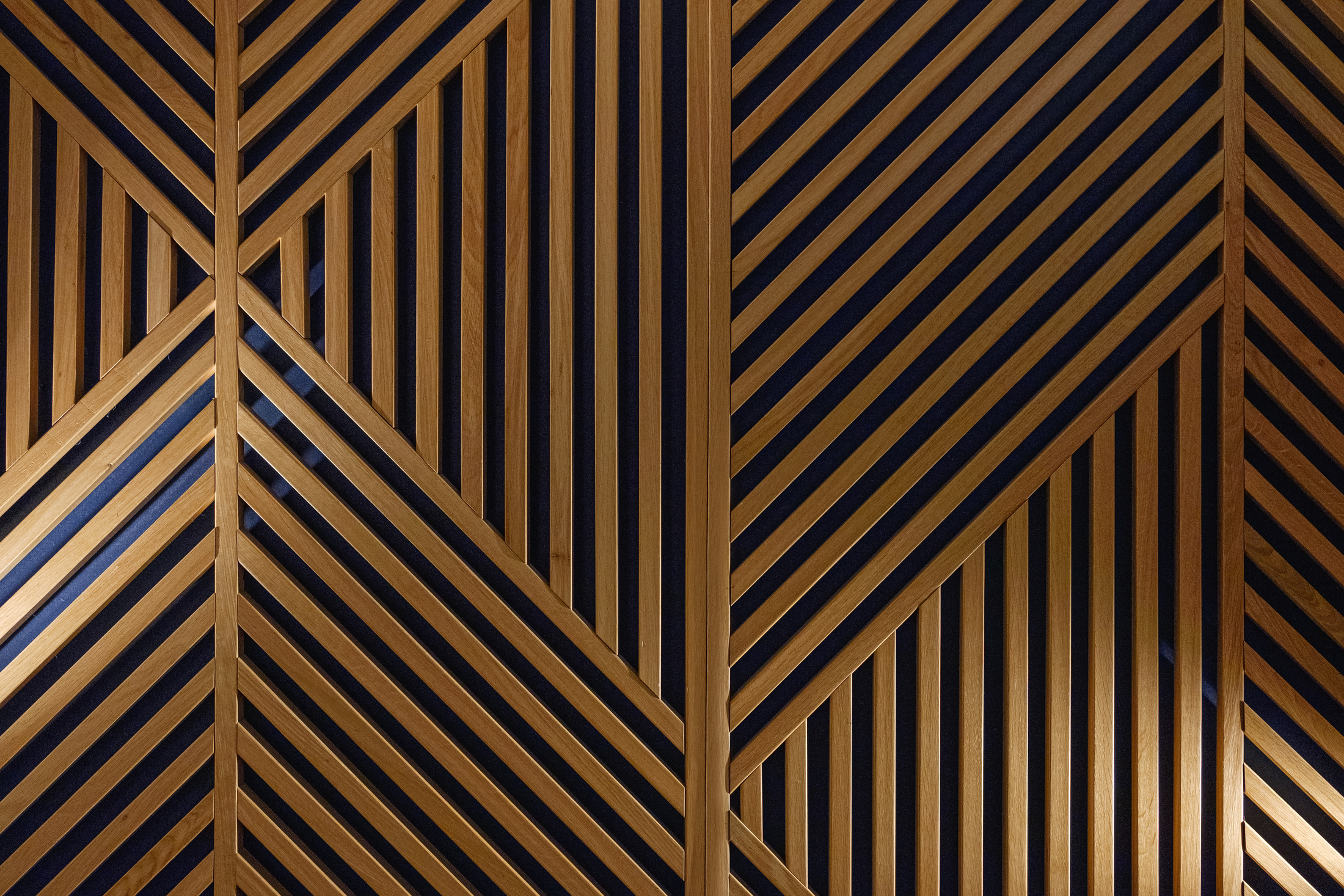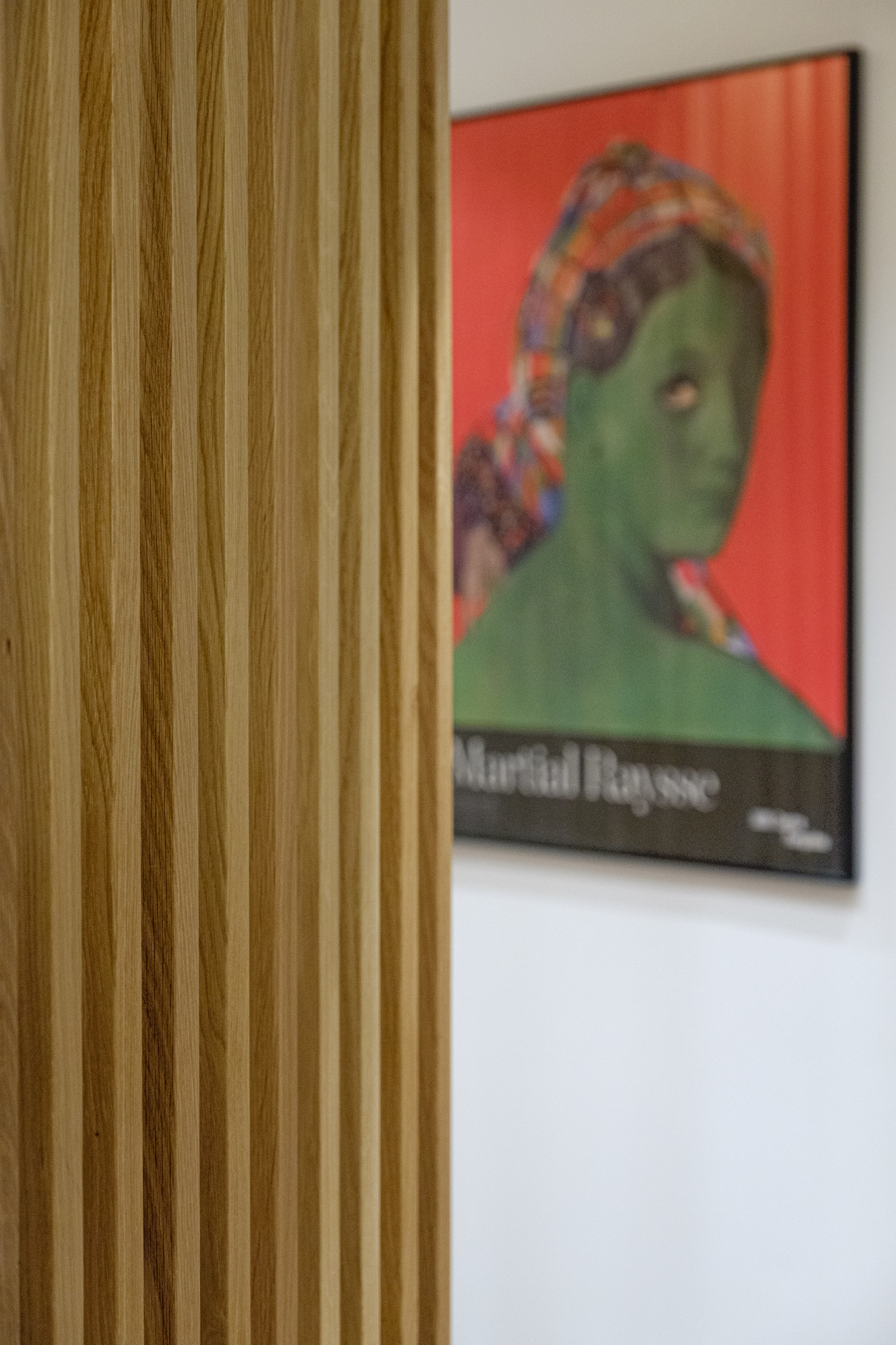 Les miroirs entre chaque tasseau en chêne permettent de dématérialiser la cloison en la présentant comme un claustra.
