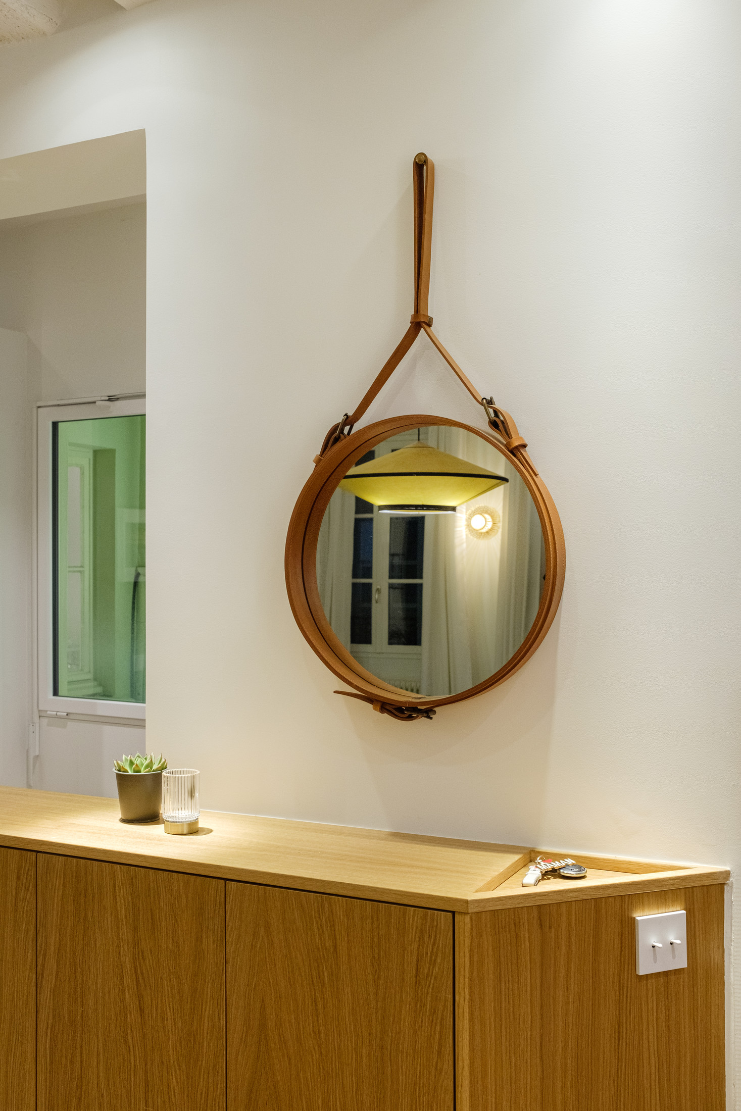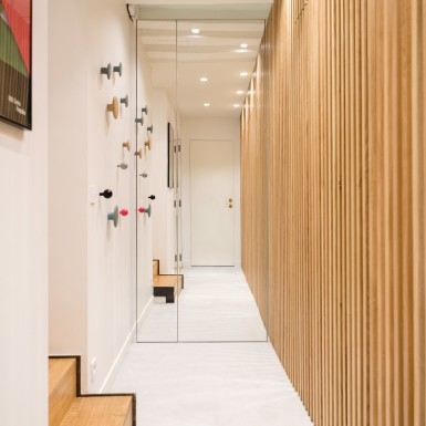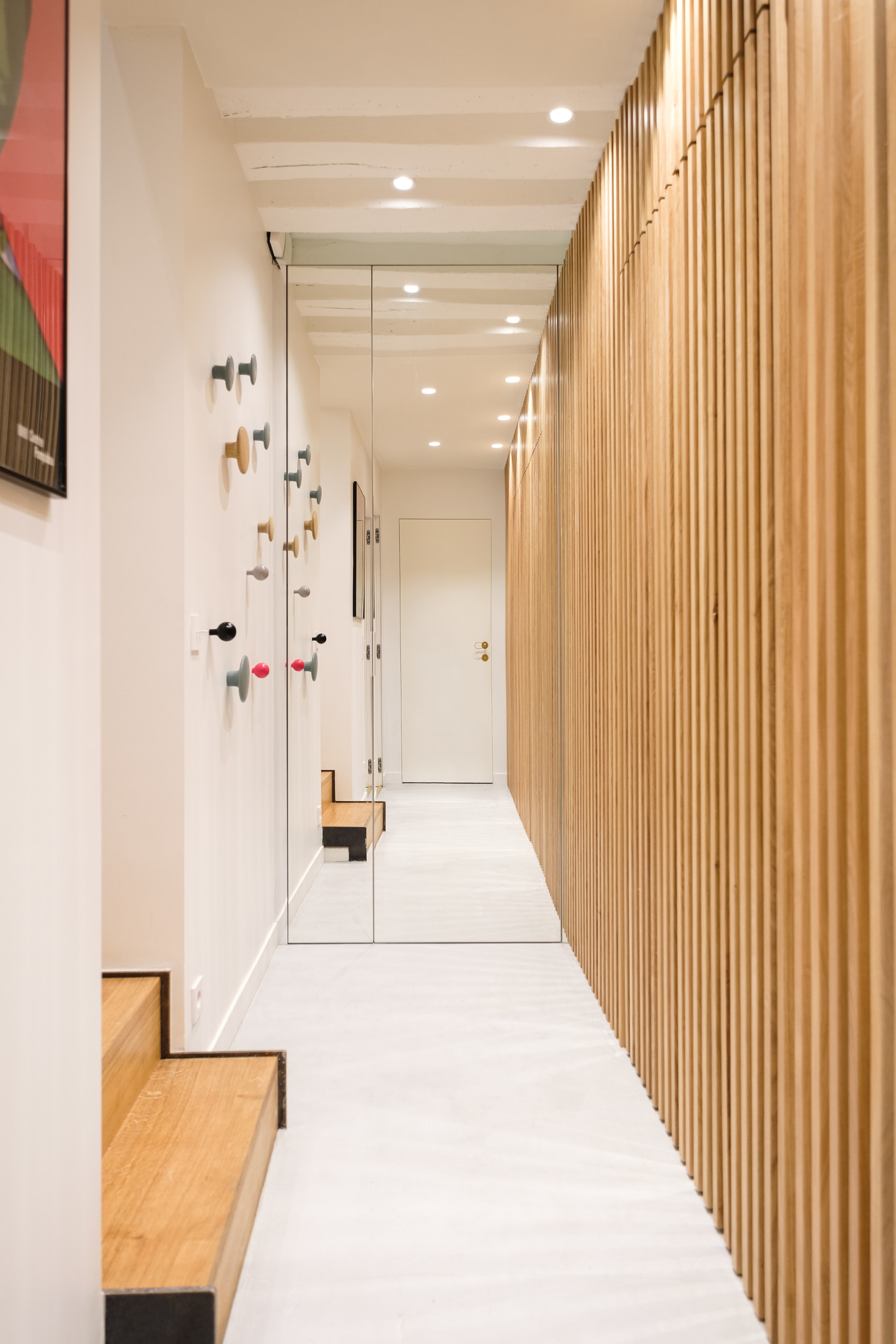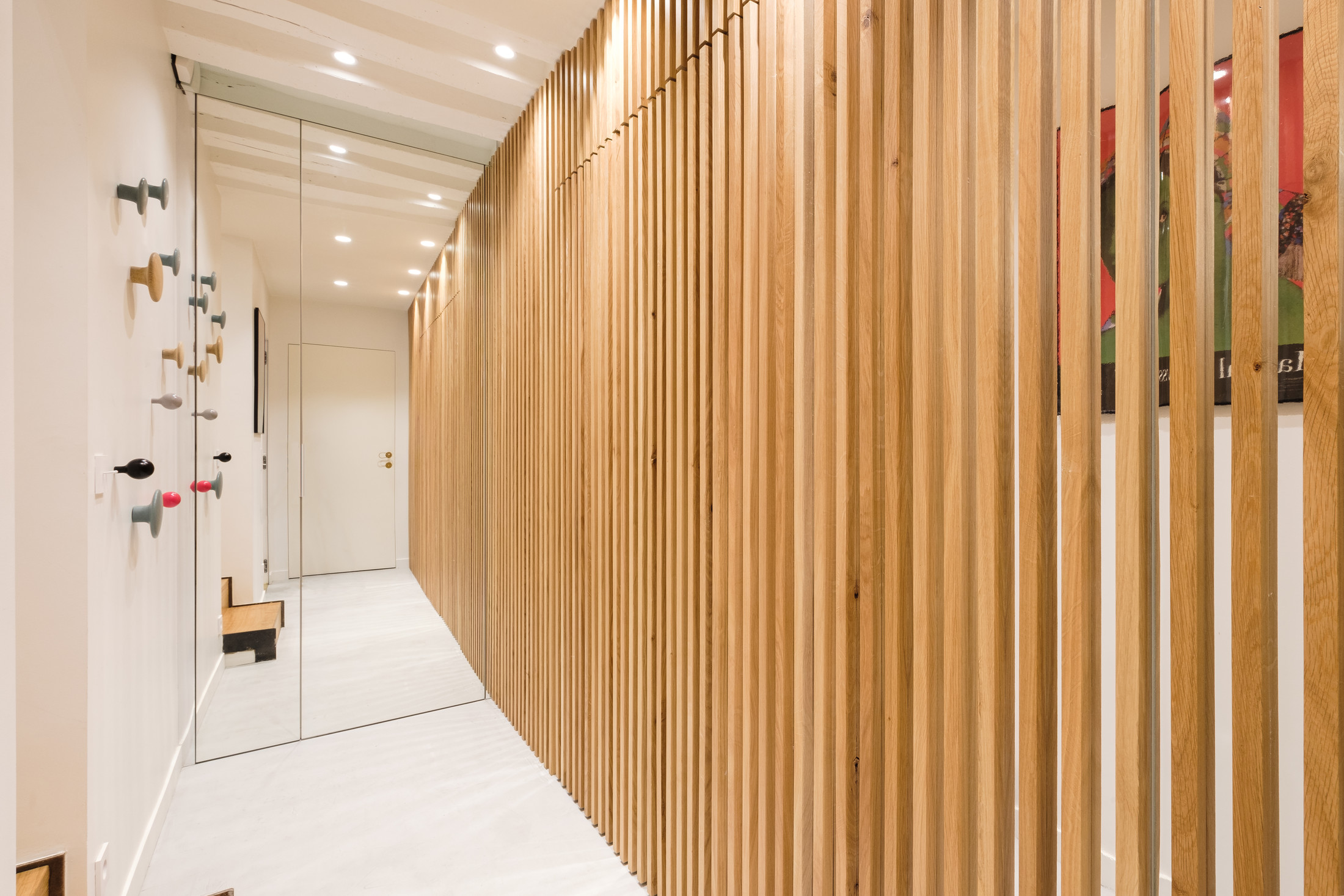 L’utilisation du tasseau et du miroir permet de jouer avec les perspectives. En effet la verticalité des tasseaux augmente la hauteur sous plafond ressentie.