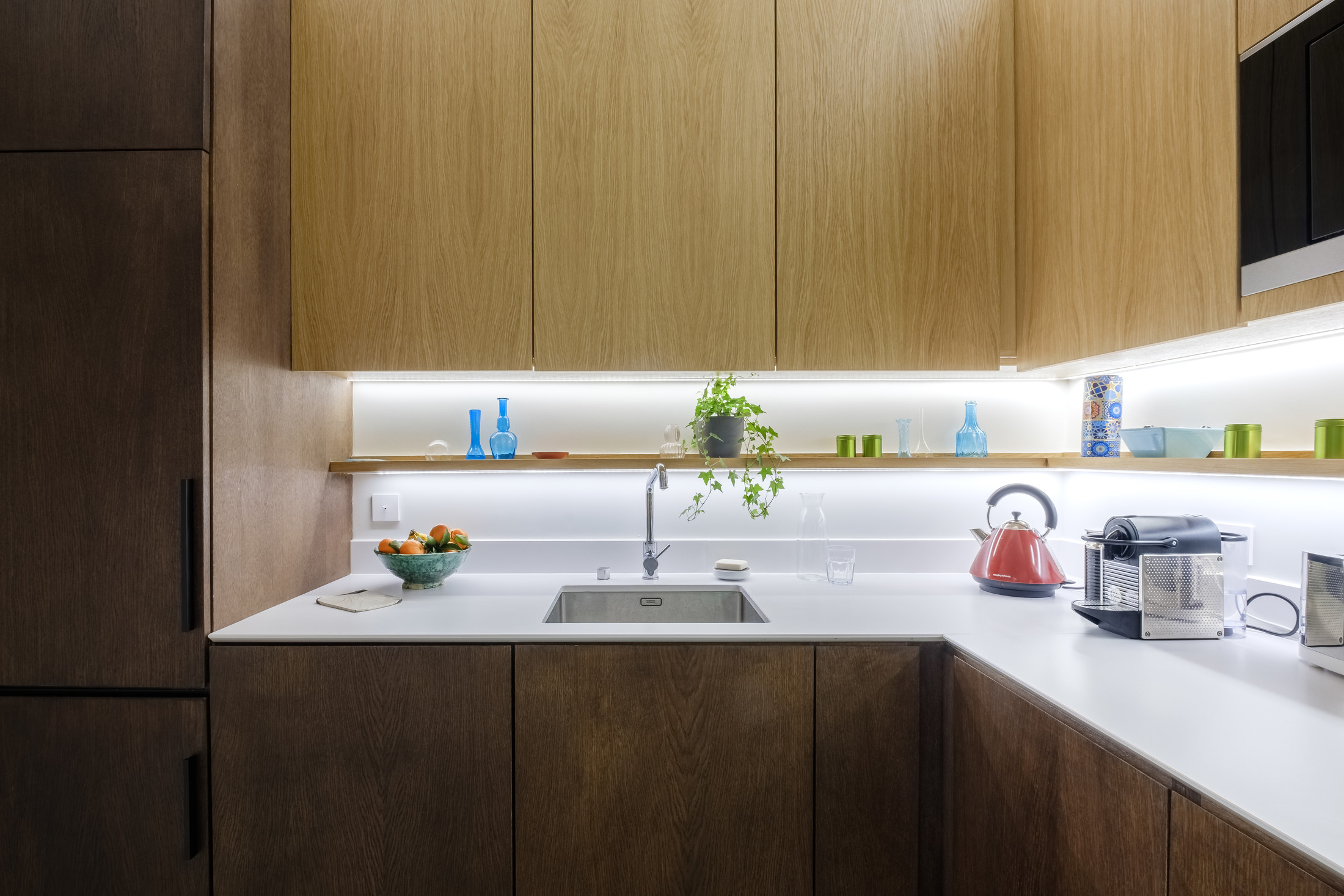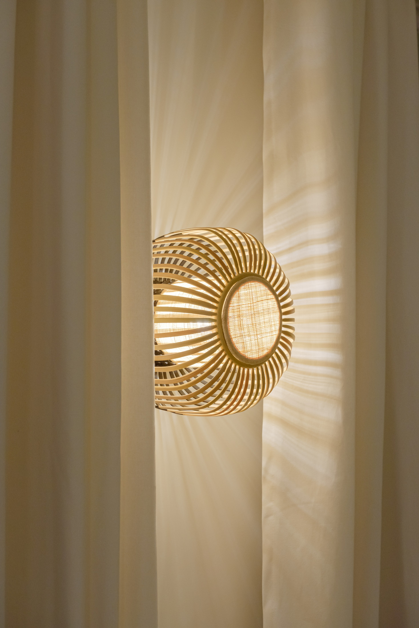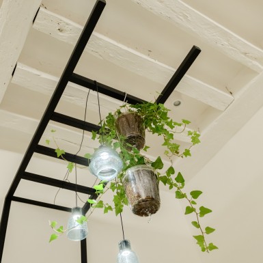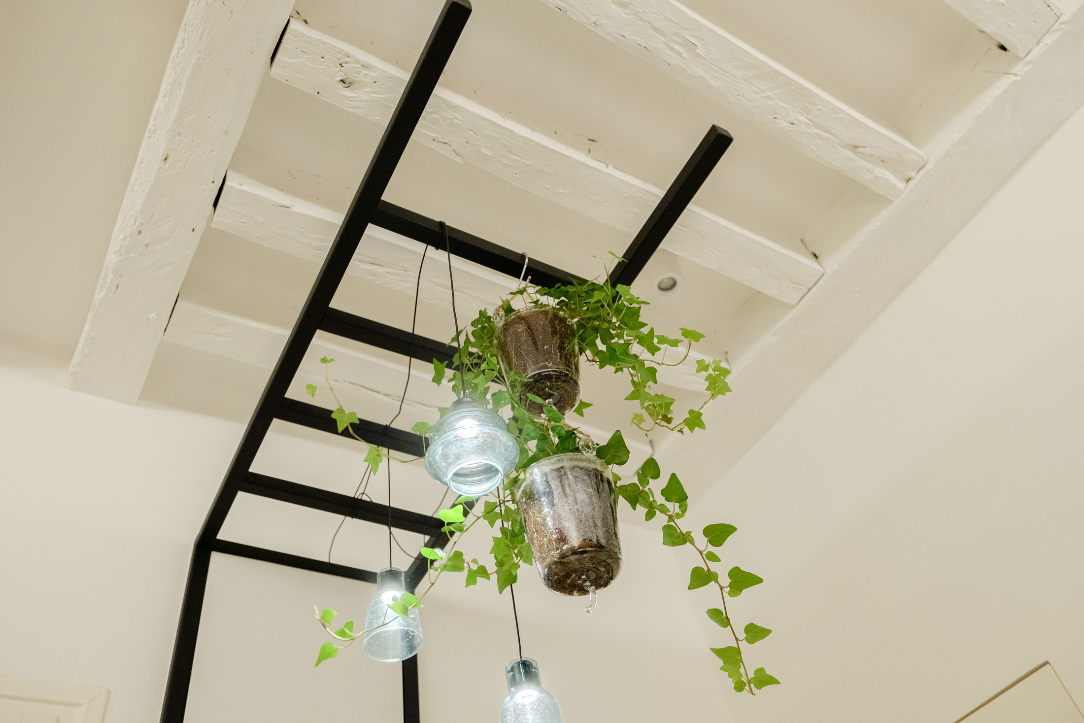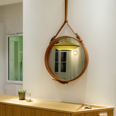 L’utilisation du tasseau et du miroir permet de jouer avec les perspectives. En effet la verticalité des tasseaux augmente la hauteur sous plafond ressentie.