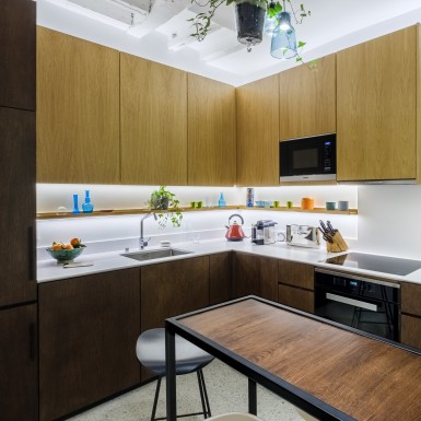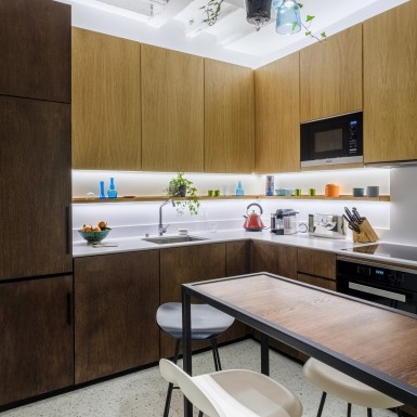 L’étage supérieur est réservé aux espaces communs et de convivialités. L’étage inférieur de 50m2  accueille 3 chambres, 2 salles d’eau et 1 wc.