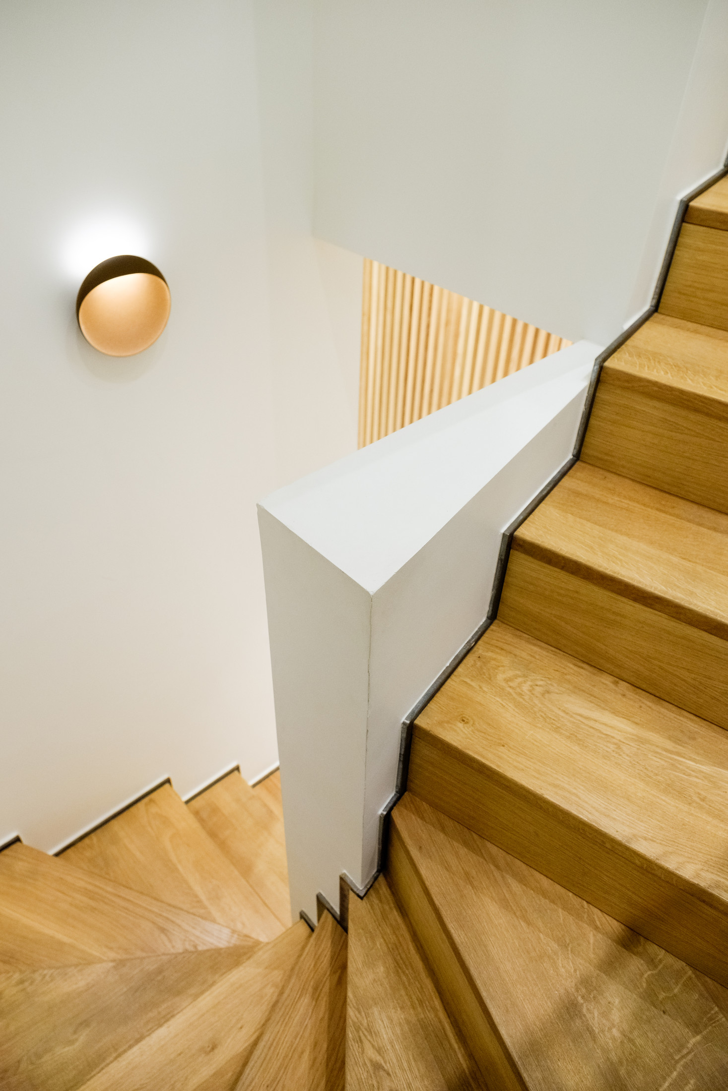 La forme de l’escalier en « col de cygne », permet d’avoir une circulation plus confortable entre la salle à manger et la cuisine.