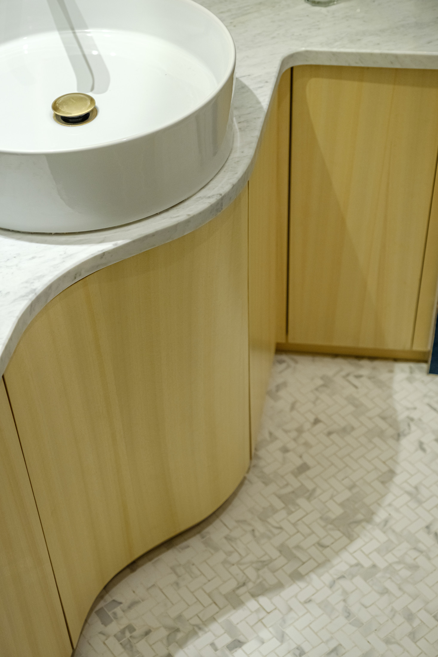 Le couloir qui dessert les chambres étant assez étroit, il nous semblait nécessaire de scénographier cet espace pour oublier sa fonction initiale et le rendre attrayant.
