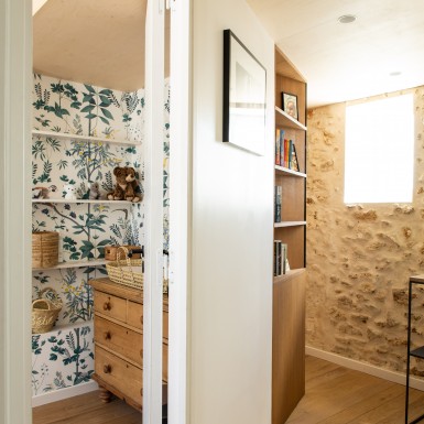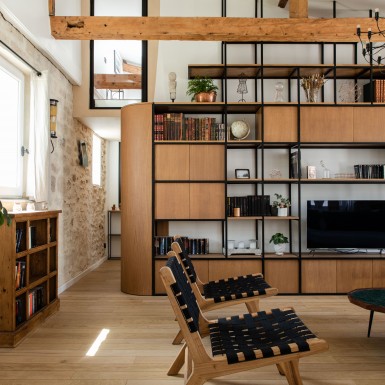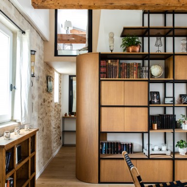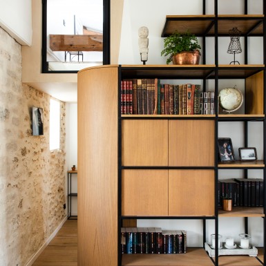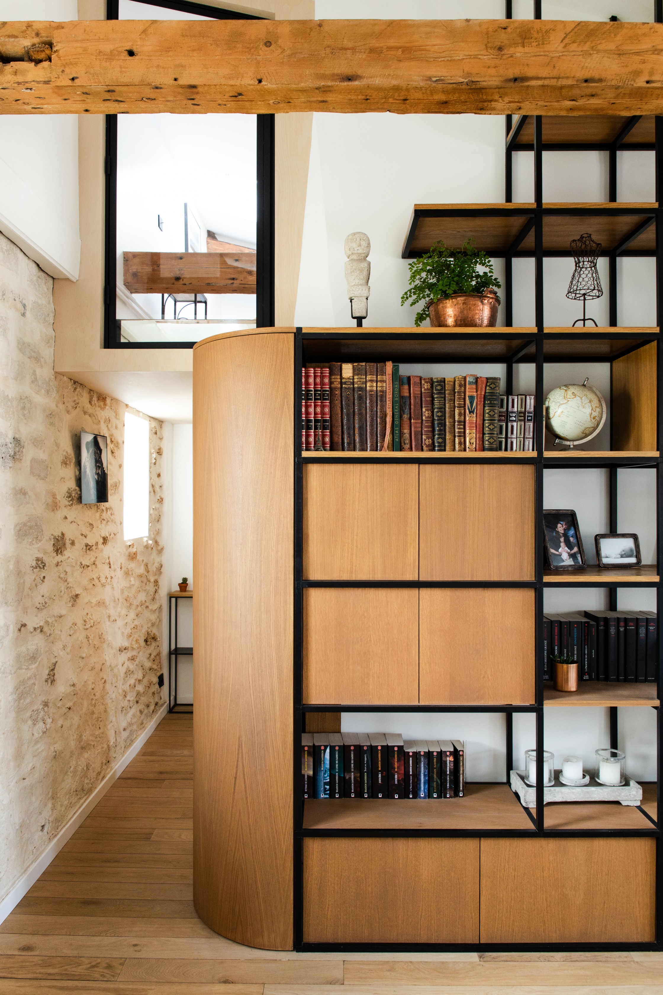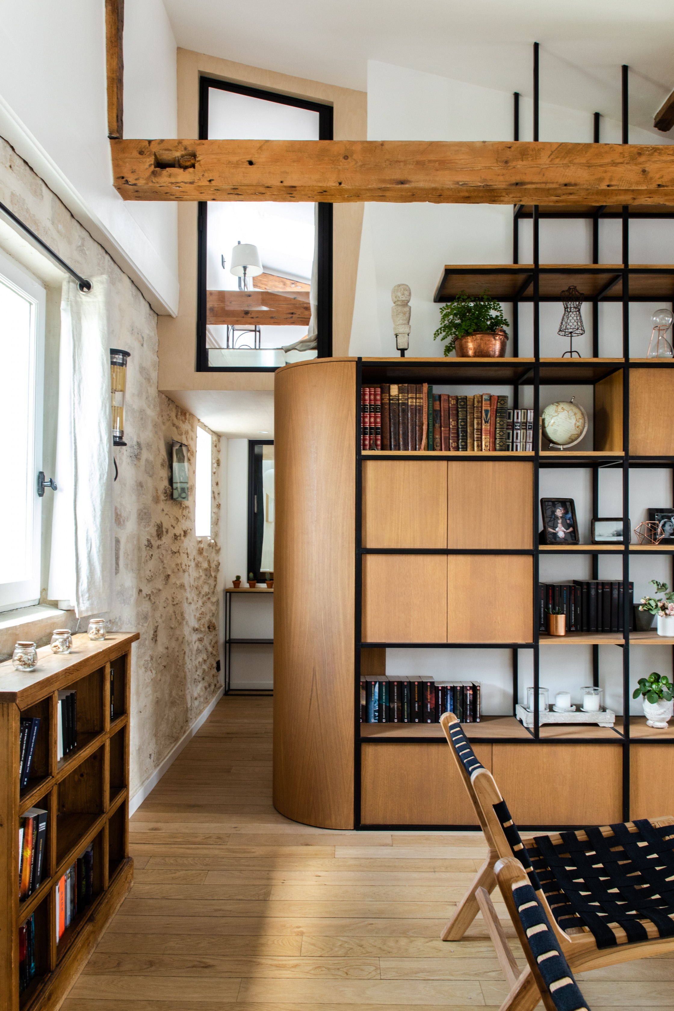 « Réalisée sur mesure, la bibliothèque a été adossée au mur porteur autour duquel elle est venue s’enrouler, dissimulant une échelle de meunier pour accéder à la mezzanine, désormais aménagée en chambre pour les invités.