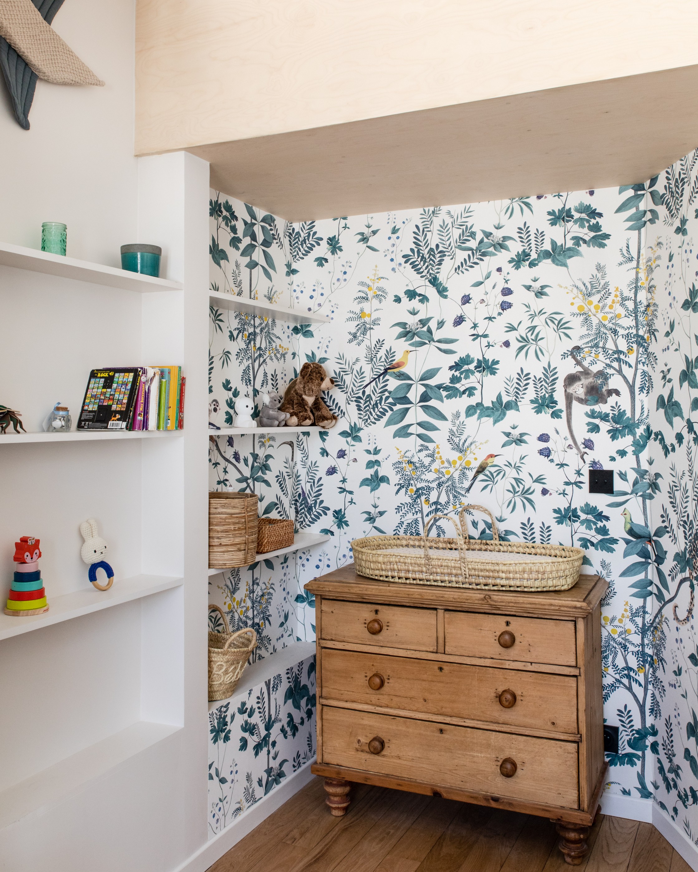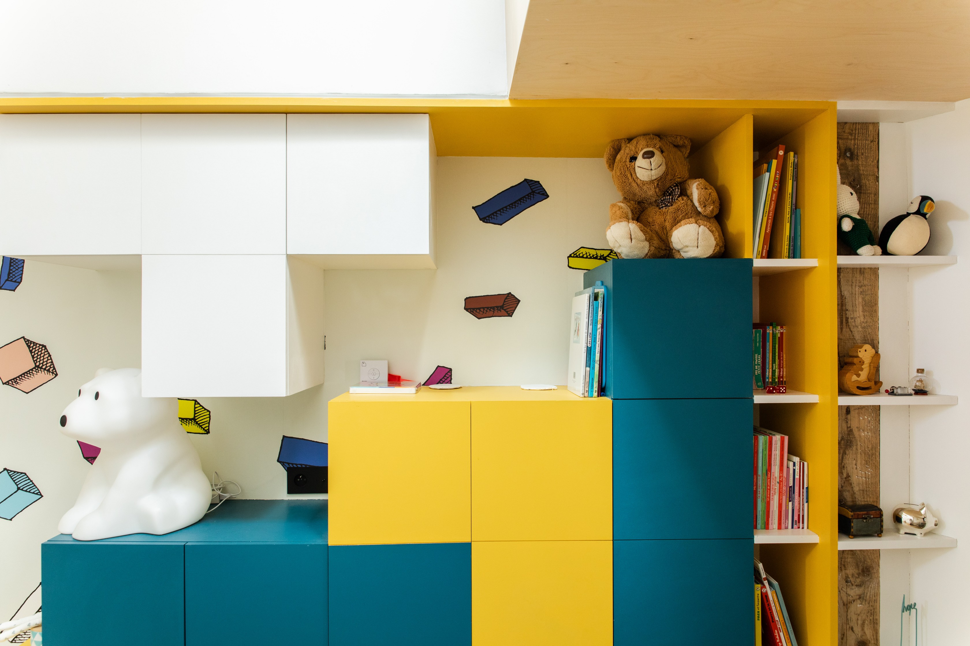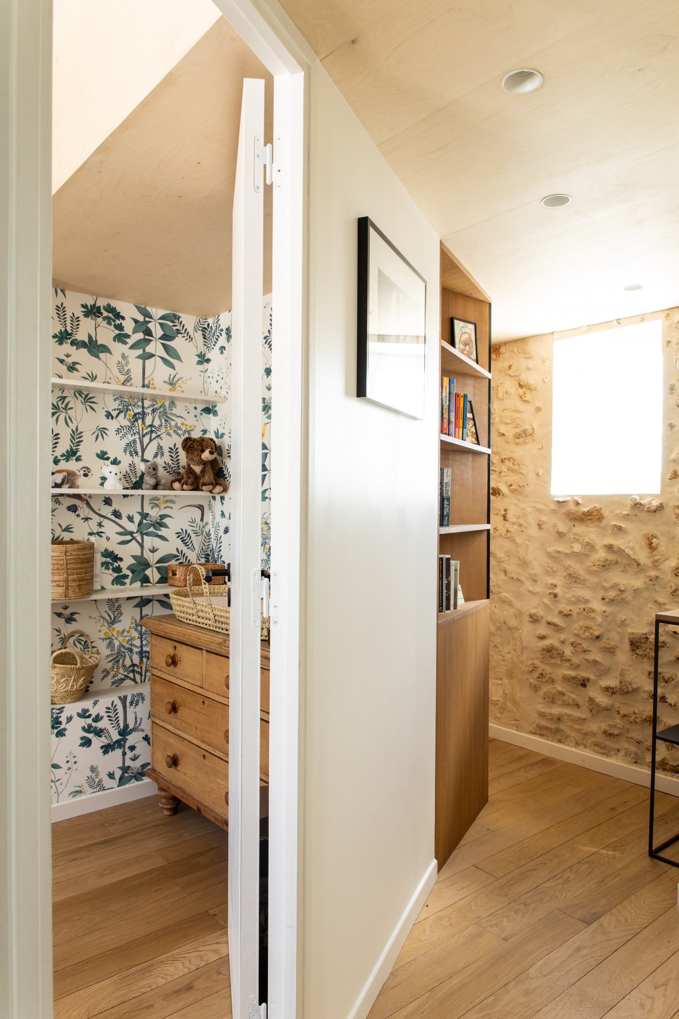 « Réalisée sur mesure, la bibliothèque a été adossée au mur porteur autour duquel elle est venue s’enrouler, dissimulant une échelle de meunier pour accéder à la mezzanine, désormais aménagée en chambre pour les invités.